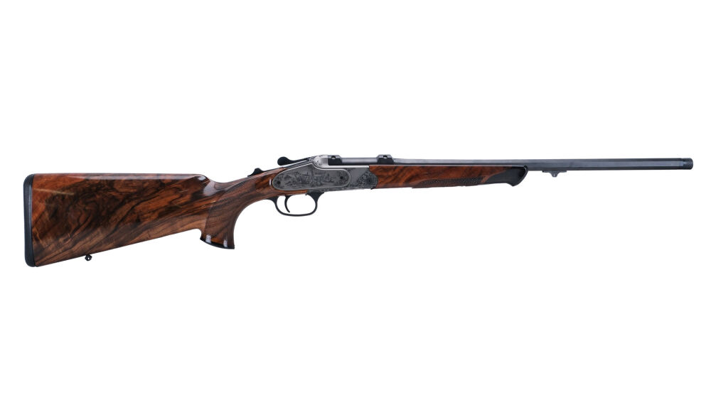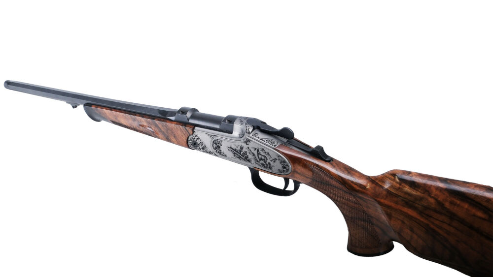 lange Seitenplatten, graviert rechts Rotwild,links Gams, feine Fischhaut Vorderschaftsabschluß Rosenholz, goldener Abzug, titanierter Verschlußkopf , MG 15x1