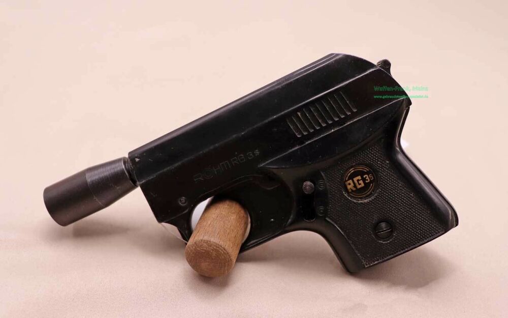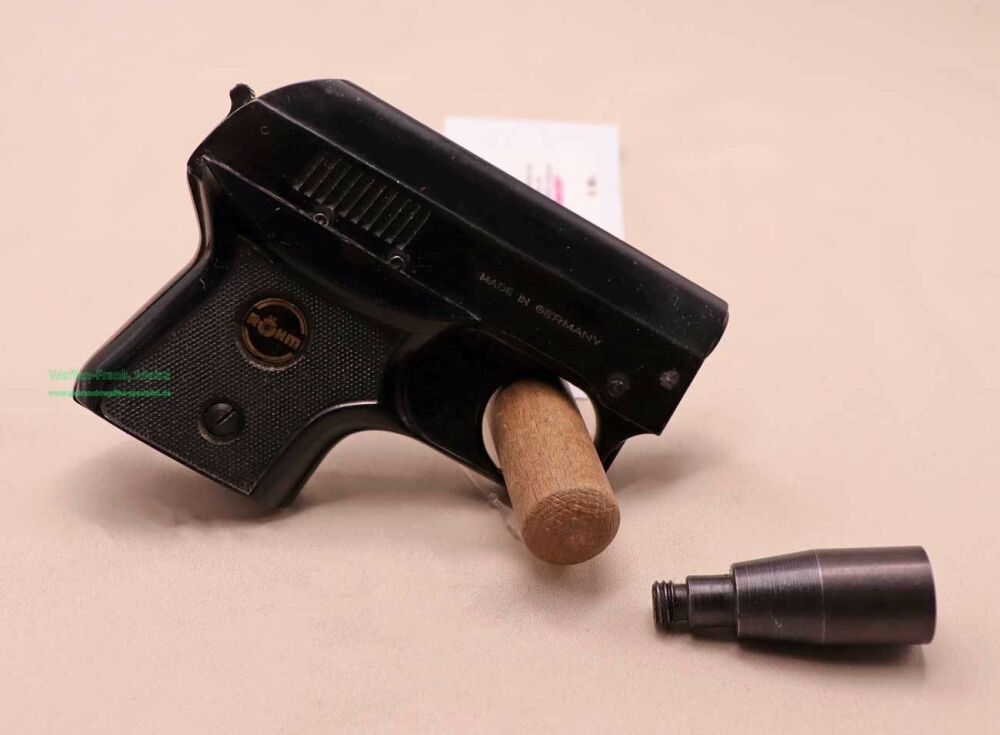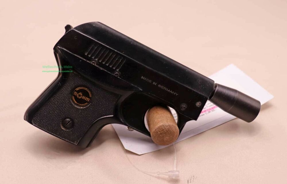 selten geschossene Schrankwaffe, noch im Originalkarton mit Kunststoffetui, Bedienungsanleitung und Putzbürste, mit abnehmbarem Signalbecher, volle Funktion einschl. 6-Schuss Magazin, noch ohne PTB (daher nur auf Sammler WBK erhältlich), Abbildung Abschussbecher (Größe, Farbe kann abweichen) beispielhaft. .....für den Sammler EUR 69,-