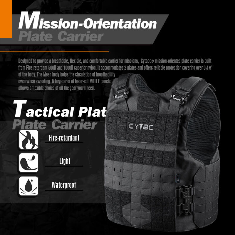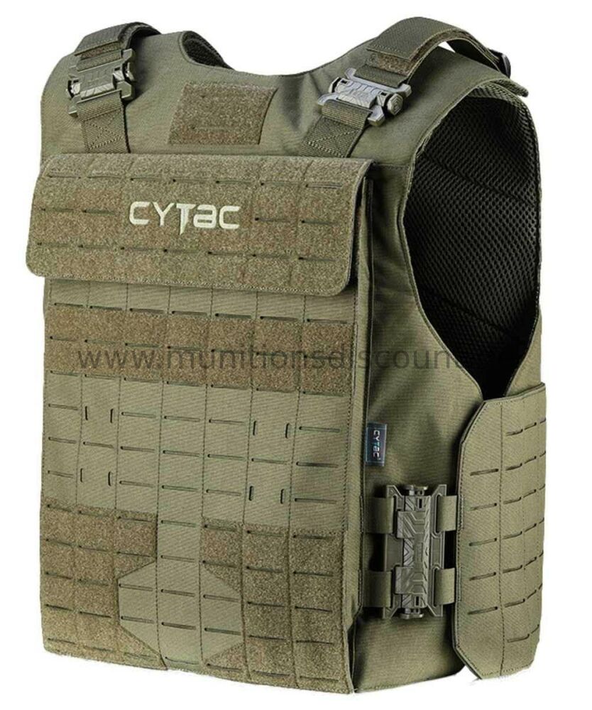 Schutzweste bzw. Plattenträger (cytac.com) in grün (OD) und Stahl-Platten Schutzklasse VPAM7 (bis .308 Win. Distanz 5m), Abm. 25x30cm, Gewicht je Platte 2,9KG, Vorderseite (SF=Strike Face) mit 3mm PU-Beschichtung als Splitterschutz, Rückseite ist mit 1mm PU beschichtet.