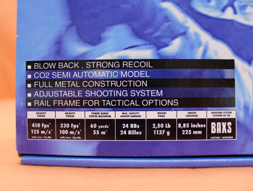 Pistole System CO2-Blow-Back (Semi-Auto)/ BAX S, Vollmetallausführung mit Polymergriffschalen, 24-Schuss Magazin. Karton als Transportverpackung.