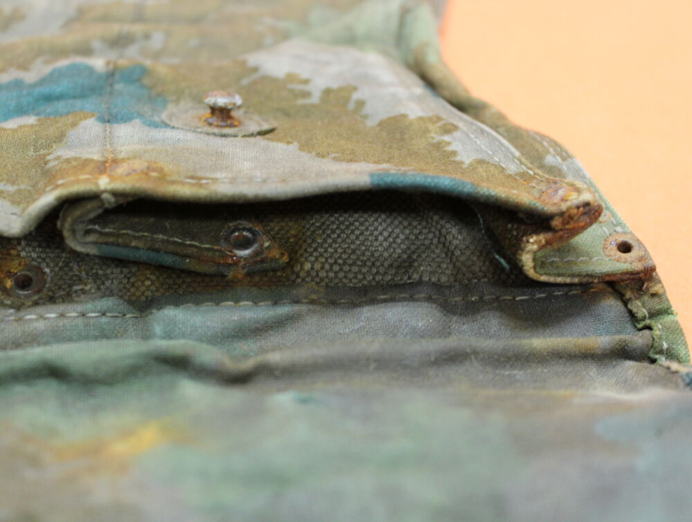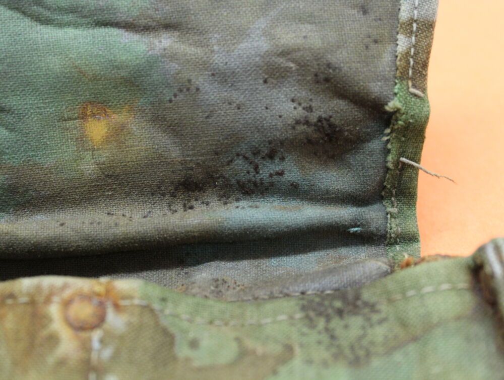 Original NVA, jedoch innen mit Tuschestempel: "Made in Germany" (als Ursprungskennzeichnung für den Export nach der Wiedervereinigung) versehen. Metallteile mit Korrosion, tlw. Rostflecken auf dem Stoff. Mittlerwile sehr selten geworden!