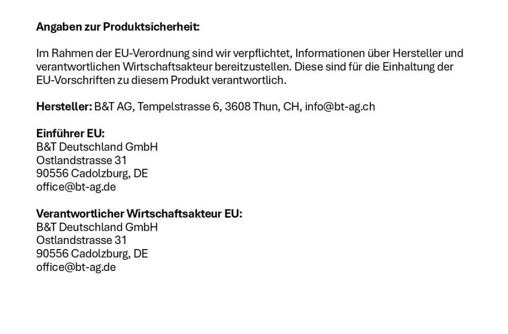 Im Rahmen der EU-Verordnung sind wir verpflichtet, Informationen über Hersteller und verantwortlichen Wirtschaftsakteur bereitzustellen. Diese sind für die Einhaltung der EU-Vorschriften zu diesem Produkt verantwortlich.