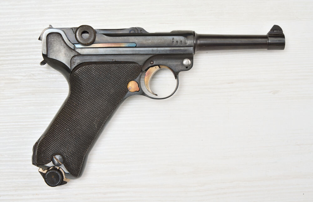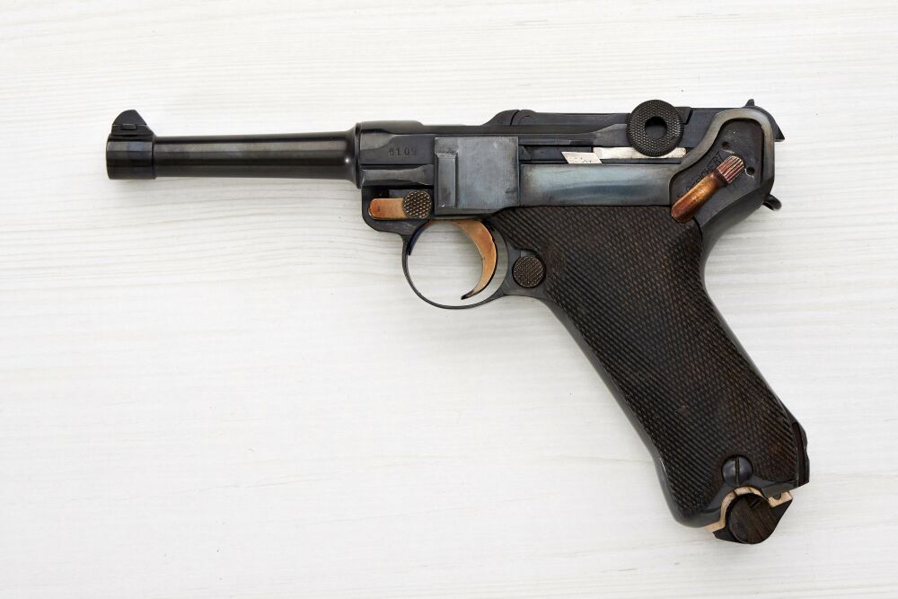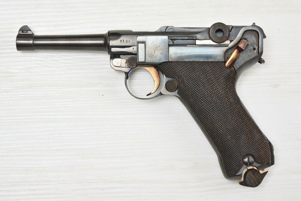 A heavily reworked, newly blued semi-automatic pistol model 08 manufactured in the ERFURT rifle factory in 1916 in 9 mm Luger calibre and serial number 6109, with a rough barrel profile. The slide housing bears the serial number 6109 on the left side, the year of manufacture 1916 on the top and the military proof mark of the ERFURT company on the right side, various military acceptance marks and the stamp RC under Kone for the Revision Commission. The three-part toggle joint bolt has the last two digits of the serial number as well as various military acceptance marks on all parts, whereby the front joint part additionally bears the military proof eagle of Gewehrfabrik Erfurt, and the centre joint bears the mark of Gewehrfabrik ERFURT. Due to the reworking, no mark is visible on the barrel. The serial number 6109 is still recognisable on the front of the grip frame as well as the military acceptance and the stamp of the inspection commission. The trigger, the safety lever with slide and the bolt are blank or tempered. The wooden grip panels with chequering are still beautifully preserved in their original condition. The body of the seamed magazine belonging to the weapon is in perfect condition, although only two thirds of the wooden magazine base is still intact.