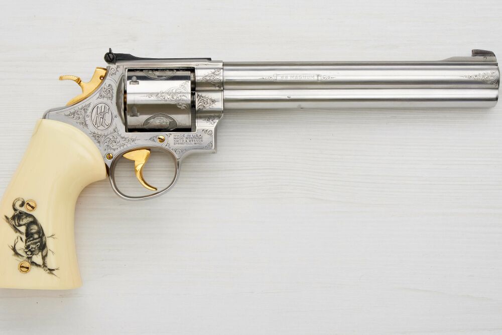 Revolver Smith & Wesson in calibre .44 Magnum, serial number BEC3342. Revolver Smith & Wesson Stainless Steel version in mint condition. Gun marked as follows: Left side of barrel SMITH & WESSON in engraved frame. Left side of grip with S&W logo discreetly engraved arabesques or tendrils. Right side of barrel in engraved frame .44 MAGNUM. Right side of frame manufacturer's details as follows: MADE IN U.S.A. MARKAS REGISTRATAS SMITH AND WESSON SPRINGFIELD MASS. Stylish vine engraving and medallion with initials HK. Cylinder engraved with arabesques with ram, puma, bear in oval. Hammer, trigger, cylinder lock, ejector with cylinder axle gold-plated. Inside of frame with the following inscription: nitro proof mark of the Ulm proof house, the Engels company, serial number as well as the model designation M629-2. Ivory-coloured plastic grip panels with portrait of bear and puma. Weapon with blued sporting sights. Barrel underside proof mark eagle N. Acquisition licence required!