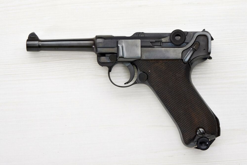 Soweit ersichtlich nummerngleiche, stärker überarbeite, im Gesamten neu brünierte Pistole Modell 08 der Firma DWM im Kaliber 9mm Luger mit der Seriennumme 70633 und neuwertigem Laufprofil. Am Verschlussgehäuse sind noch die Reste des militärischen Beschusses und der militärischen Abnahmen vorhanden und der Laufnocken trägt die Ziffer 33 als Teil der Seriennummer. Auf dem Lauf sind keine Angaben mehr erkennbar. Der Verschluss trägt seitlich am Vordergelenk den militärischen Beschuss der Firma DWM und die Ziffer 33 als die letzten zwei Ziffern der Seriennummer. Auf dem Mittelgelenk das Markenzeichen der Firma DWM und auf dem Hintergelenk wiederrum die letzten zwei Ziffern der Waffennummer. Das Griffstück trägt als einzige Kennzeichnung an der Vorderseite die Seriennummer 70633. An der Waffe befinden sich sehr schön erhaltene oiginale, hölzerne mit Fischhaut versehene Holzgriffschalen. Das in der Waffe befindliche Magazin stellt eine Reproduktion dar. Nach einem aktuellem Beschuss ist die Pistole 08 zum Ordonnanzschießen bestens geeignet.