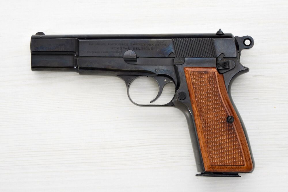 Pistole FN M1935 im Kaliber 9 mm Luger für das deutsche Heereswaffenamt in schönem Gesamtzustand. Neubrünierte FN mit üblicher Standartbeschriftung am Schlitten sowie Beschuss Adler HK und WaA Abnahme unter stelisiertem Adler WaA140; gleicher Beschuss und Abnahme auf der linken Seite des Griffstückes sowie MR im Abzugsbügel. Beschuss Adler HK auf dem Lauf im Bereich des Auswurffensters sowie Seriennummer linear auf Lauf, Verschluss und Griffstück. Braune Holzgriffschalen mit Fischhaut und originales Magazin. Erwerbscheinpflichtig!