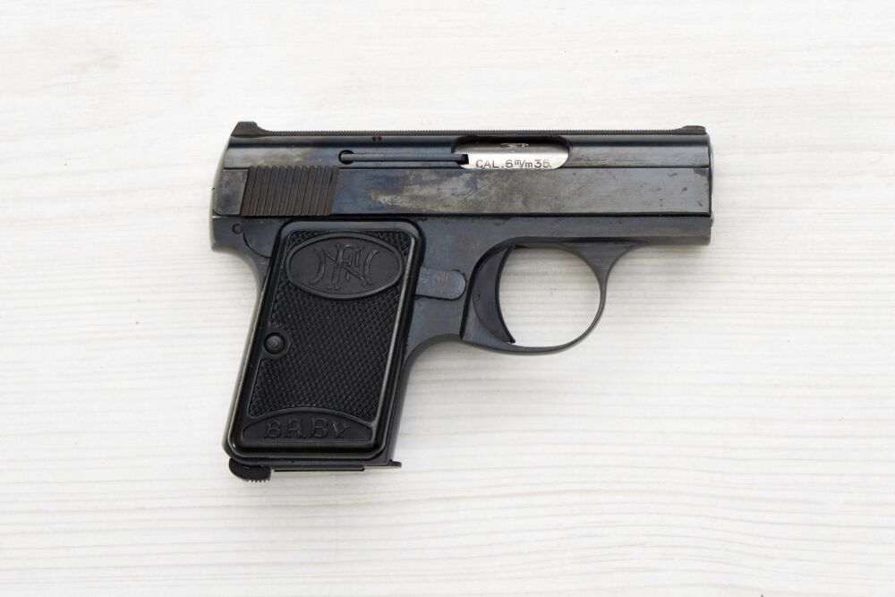 Pistol FN Baby in caliber 6.35 mm Br. in mint condition. Breech on left side three-line standard inscription. Right side grip serial number and logo of import company Geco. Barrel in area of ejection window with Belgian proof and caliber markings. Black plastic grip panels with checkering, FN-Lgog and model designation BABY as well as magazine with FN logo. Subject to purchase certificate!