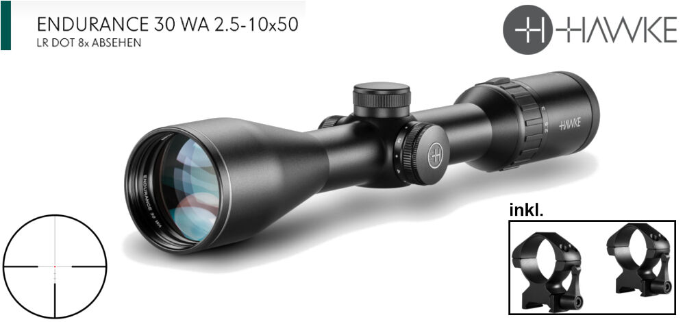 - Zielfernrohr: Hawke Endurance 2.5-10x50 Abs.: LR Dot (vgl. Absehen 4 mit Leuchtpunkt)
