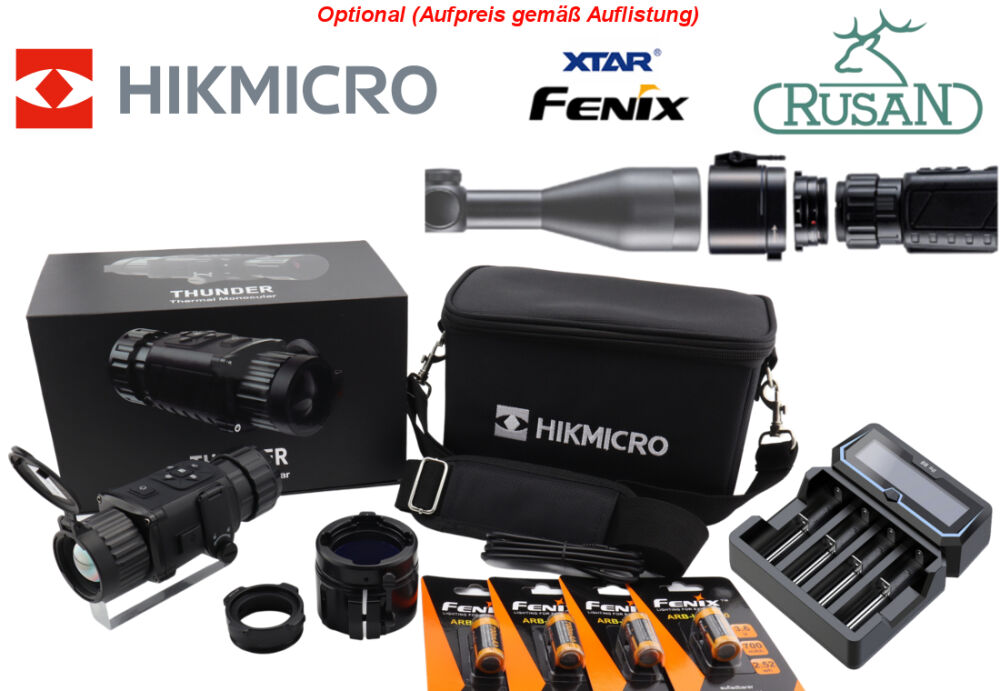 | Wärmebild Vorsatzgerät HIKMICRO Thunder TH35PC clip-on inkl. Rusan Connector, Schnellverschluss-Adapter, Ladegerät, 4x Fenix Akku 700mAh |