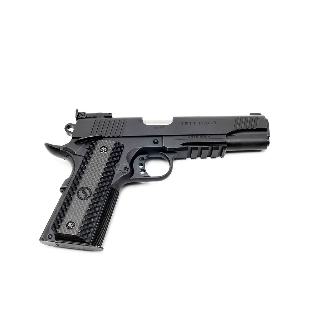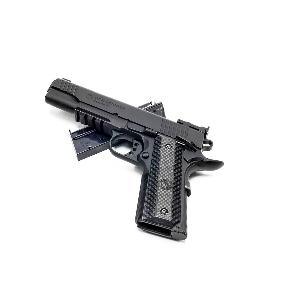 Die Schmeisser 1911 Hugo ist nicht nur funktional, sondern auch optisch ansprechend. Die echten Karbon Griffschalen mit passenden Schrauben verleihen der Waffe eine edle Optik. Die vergrößerten Auswurffenster und die Picatinny Schiene am Griffstück erlauben das einfache Anbringen von Zubehör.