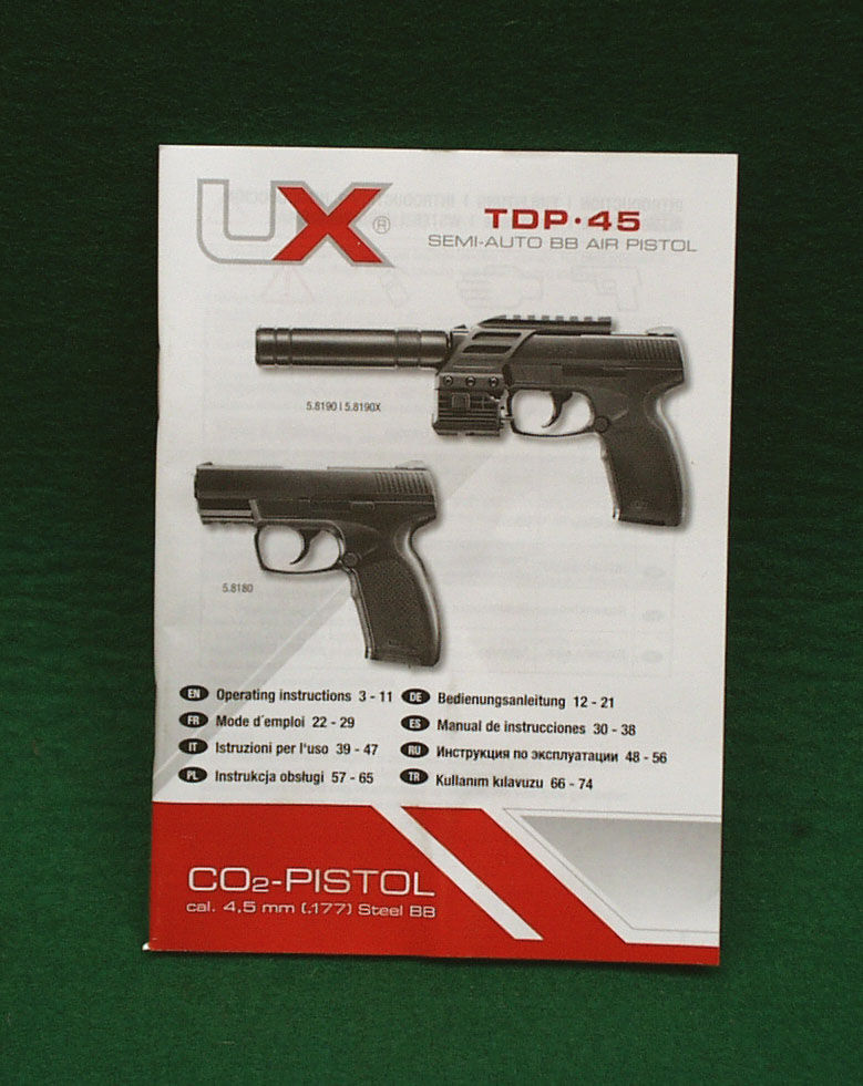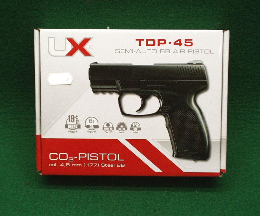 UX TDP 45 Semi-Auto BB Air CO2 Pistole 4,5mm (.177) Steel BB Abzug: Double Action only Schusskapazität: 19 Schuss Energie: ca.1,25Joule Antrieb: 12g Co2 Kaliber: 4,5mm Stahl BB Länge: ca. ... ...weiterlesen