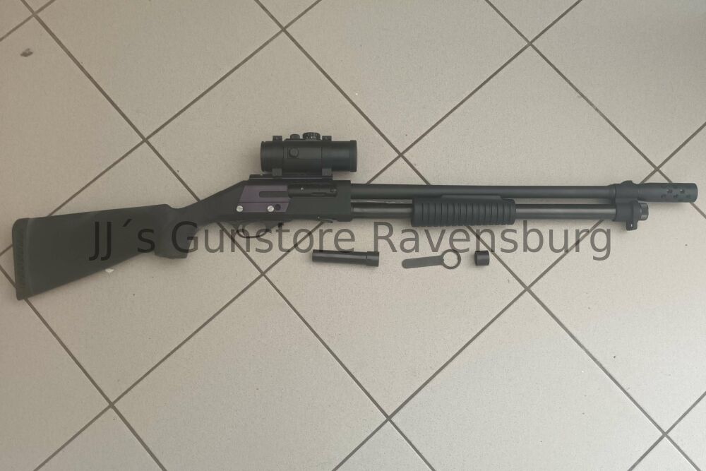 Imperator SDASS Repetierflinte 12/70 mit Compensator, montiert mit VariDOT 50mm und Wechselchokes, Zustand nahezu neuwertig