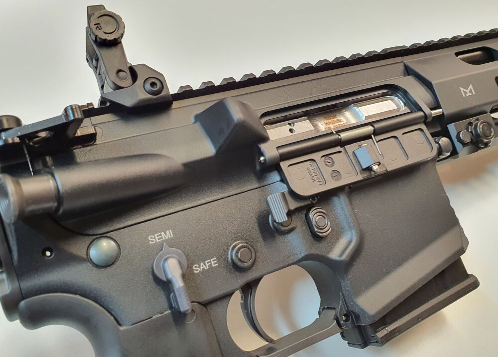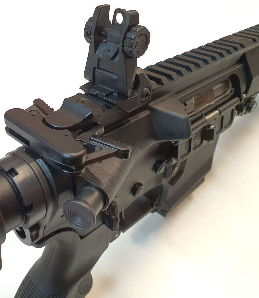 Höchste Funktionssicherheit durch „indirekte Gasentnahme“, die zugleich Schmutzablagerungen aus Pulvergasen auf ein Minimum reduziert. Sicherung in entspanntem Zustand möglich. Trocken stehender Direktabzug. Handschutz am Lauf werkzeuglos abnehmbar, mechanisches Klappvisier.