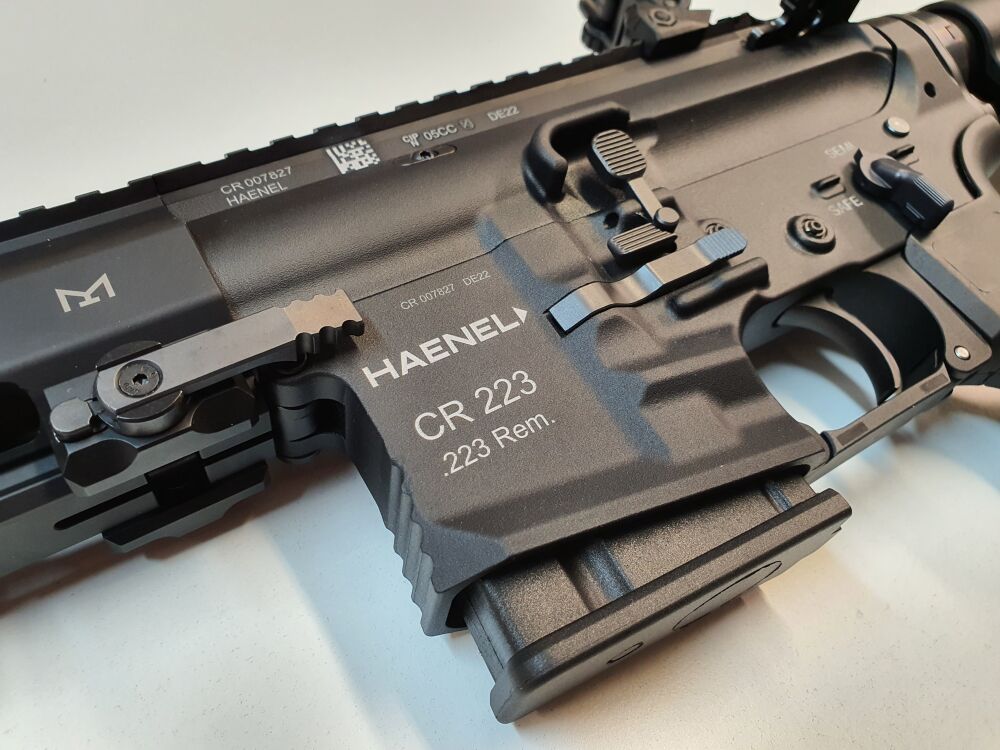 Haenel CR 223Mit der „Competition Rifle“ 223, kurz CR 223 knüpft die Waffenschmiede Haenel an Ihre lange Tradition in der Fertigung von halbautomatischen Büchsen an. Einst wurde bei C.G. Haenel in Suhl das erste Sturmgewehr der Geschichte gebaut und entwickelt. Es handelt sich bei der CR 223 um eine halbautomatische Büchse mit Pistonsystem im Kaliber .223 Rem. auf Basis des legendären AR 15 Systems. Als moderner Selbstlader in Zentralfeuer-Ausführung, funktioniert auch die Haenel CR 223 als Gasdrucklader mit Drehkopfverschluss. Der Teleskop-Hinterschaft ist in sechs Stufen längenverstellbar. Die Büchse verfügt über einen freischwingenden, kaltgehämmerten Lauf Lauflänge: 267 mm erhältlich ist. Das Gewicht beträgt 3,5 kg. Neben dem Direktabzug mit ca. 3200 g ist auch ein optionaler Feinabzug erhältlich, dieser löst bei ca. 1500 g aus. Die Sicherung ist beidseitig bedienbar.