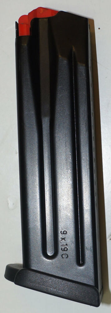 Magazin, Heckler & Koch, SFP9; P30, 15Schuss. Das Magazin fasst 15 Schuss im Kaliber 9x19mm. Obwohl die Magazine keine äußeren Nutzungsspuren wie Kratzer oder ähnliches aufweisen, kann die Unbenutztheit nicht garantiert werden. Mit rotem Zubringer.