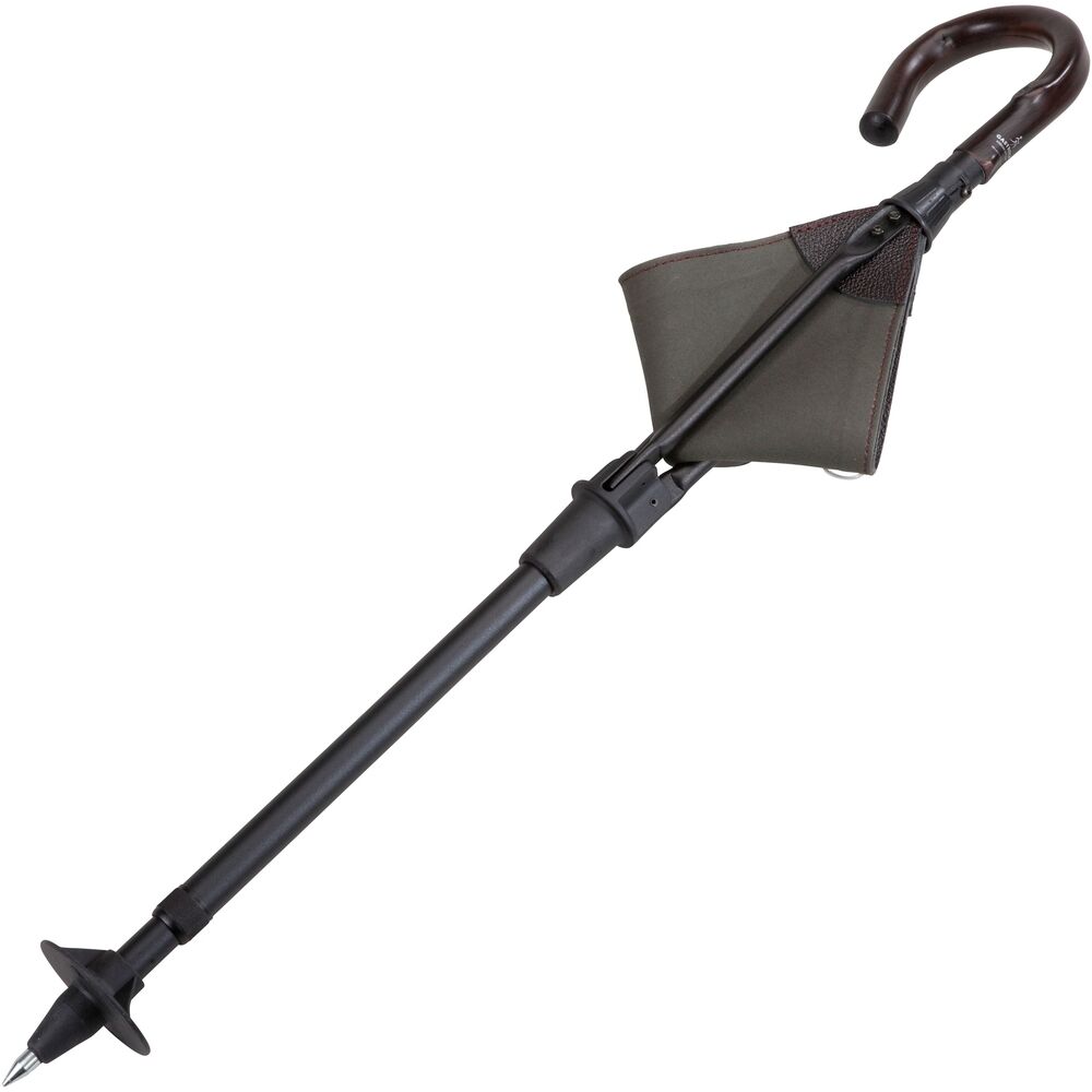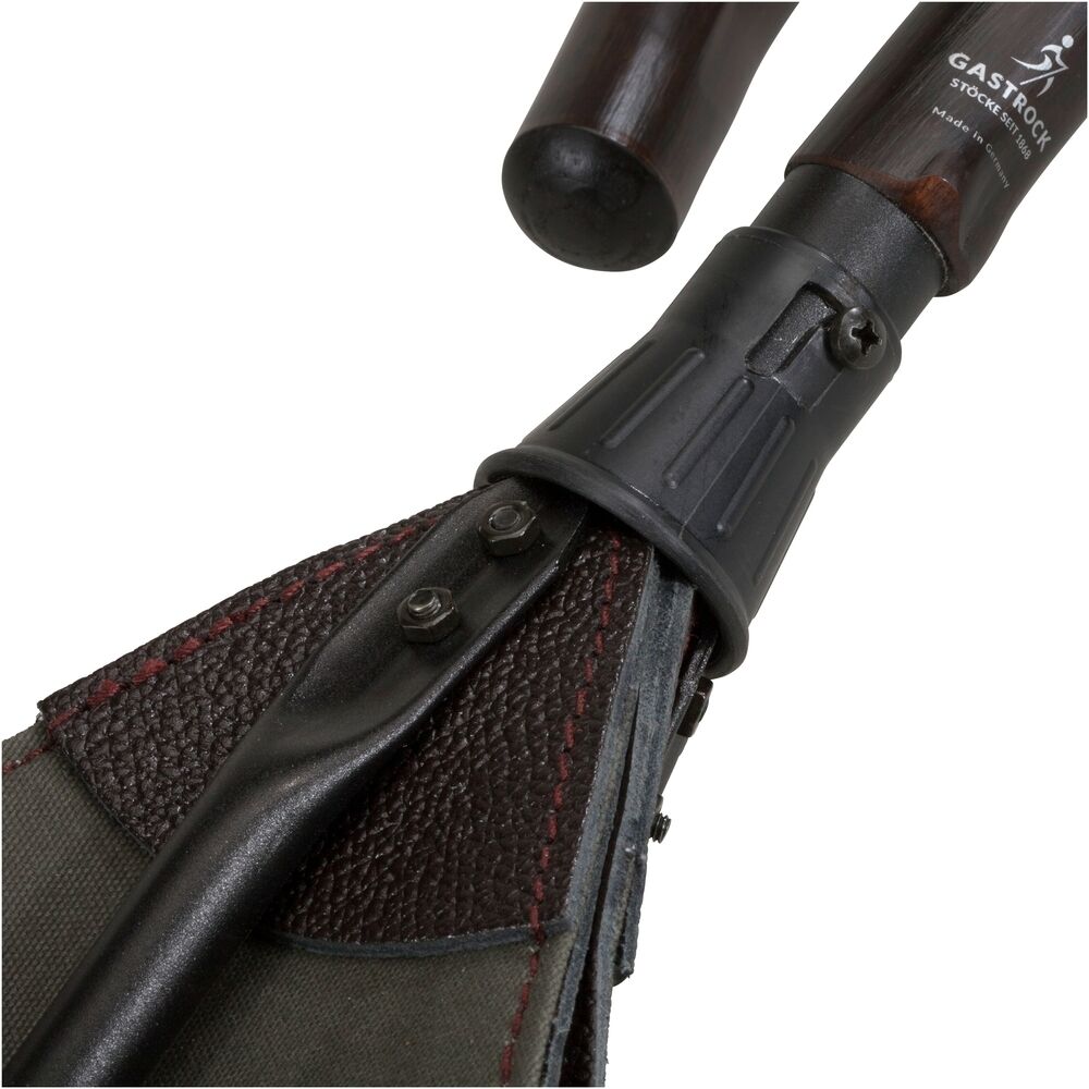 Jagdsitzstock mit sicherem Drehverschluss. 9-fach höhenverstellbares Unterteil aus beschichtetem Aluminium. Rundhakengriff aus Kastanienholz. Echter Ledersitz mit Segeltuch hinterlegt. Eine Tellerzwinge verhindert das Einsinken in weichem Untergrund. GS-geprüft.