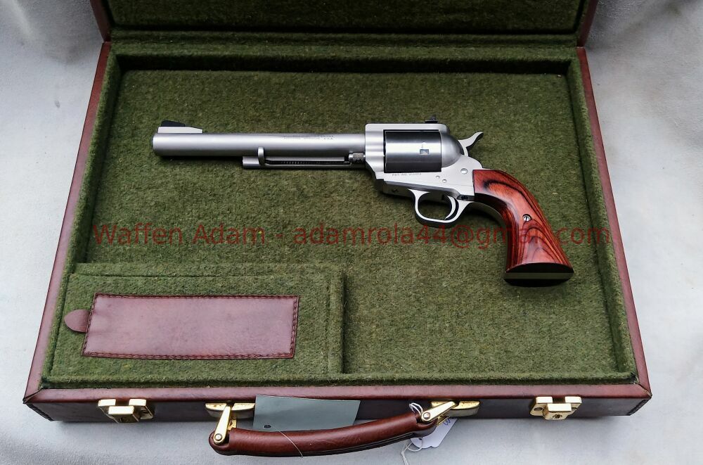 Rötliche glatte Schichtholz Griffschalen. Micro Meter Visier und Balkenkorn. 7,5 Zoll Lauflänge. Stainless Steel. Inclusive Koffer mit grünem Filz ausgeschlagen, mit Teilefach. 2998.-€ Neupreis 3998.-€