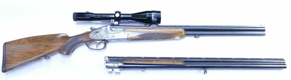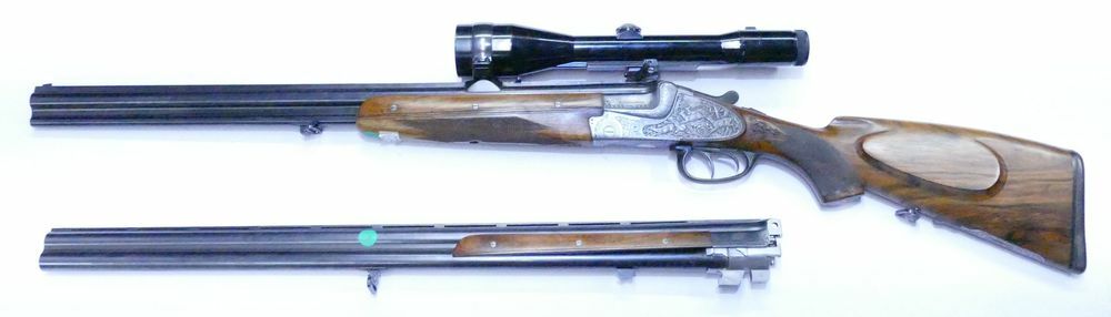 Seitenschlosse erhaben graviert von NOrbert Triebel u. Hans Obiltschnig, Klappdeckelmagazin, dunkles Maserholz, mit Zeiss 2,5-10x52 Bockflinten-Wechsellauf 12/70 im Lederkoffer Bitte beachten Sie... ...weiterlesen