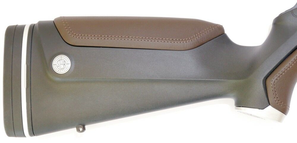 Steyr Monobloc. Revolution in jeder Hinsicht. Handspannung, Kammersperre und eine herausnehmbare Abzugseinheit garantieren für absolute Sicherheit. Lauf und Gehäuse sind aus einem Stück gefertigt = Monobloc. Ledereinlagen im Vorderschaft, des Griffs und der Backe bieten eine optimale Griffigkeit.