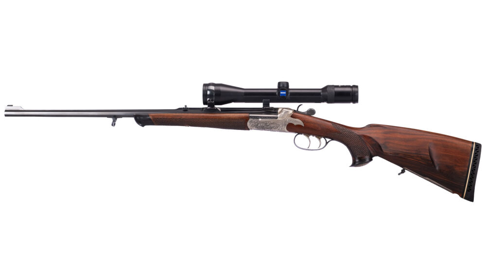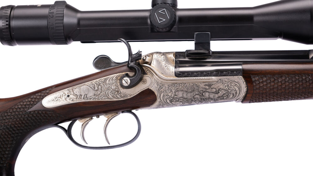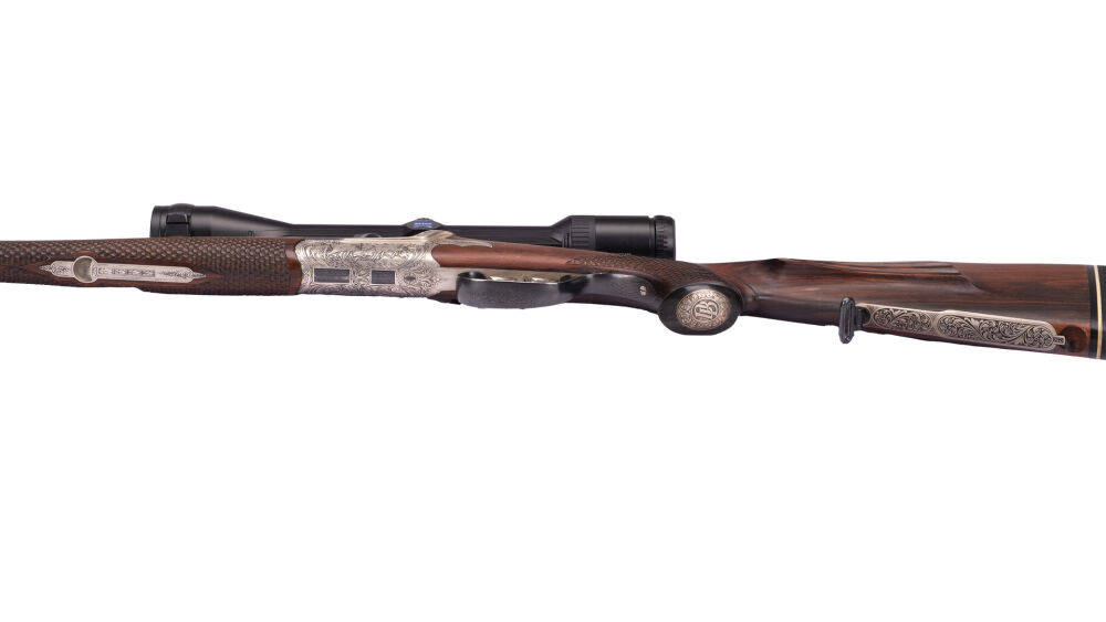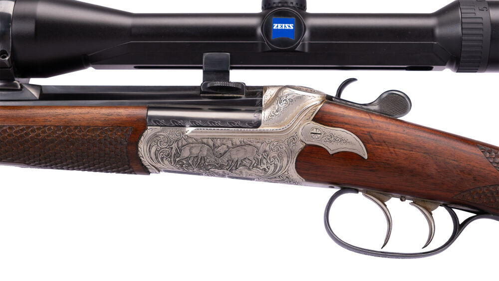 8-kant Lauf mit Roundbody Systemkasten, Seitliche Hahnspannung, graviert links Gams, rechts treibender Rehbock, Hahnnplatte Fuchs, Schaft mikt bayr. Backe Doppelfalz, Schaftmagazin graviert engl. Laub, mit Schuppenfischhaut, montiert mit Zeiss Diavari 5-15x42 A 4 SEM