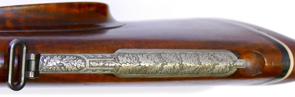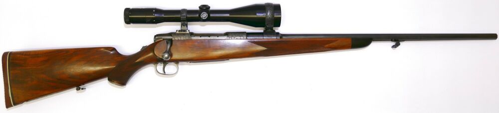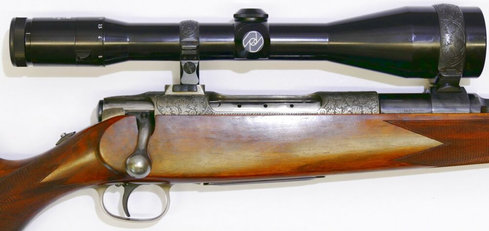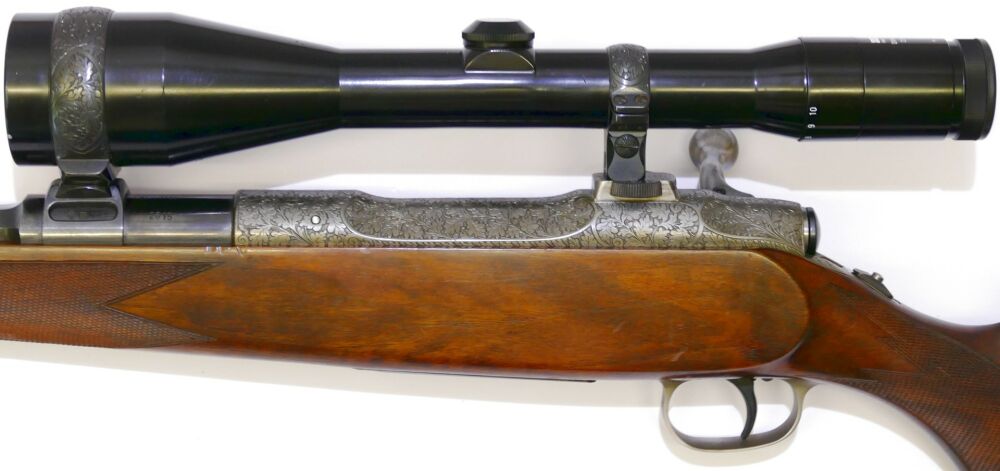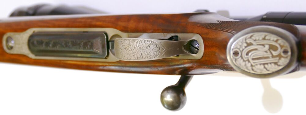 Montiert mit Zeiss 2,5-10x52 ZA, vollgraviertes System mit Eichenlaub inclusive Abzugsbügel und Montage. Achtkantlauf mit ausgesuchter Schussleistung, 66cm Lauflänge, Schaft mit geradem Schaftrücken, Deutscher Backe, 36cm Schaftlänge, Schaftmagazin mit Gravur, Kombiabzug