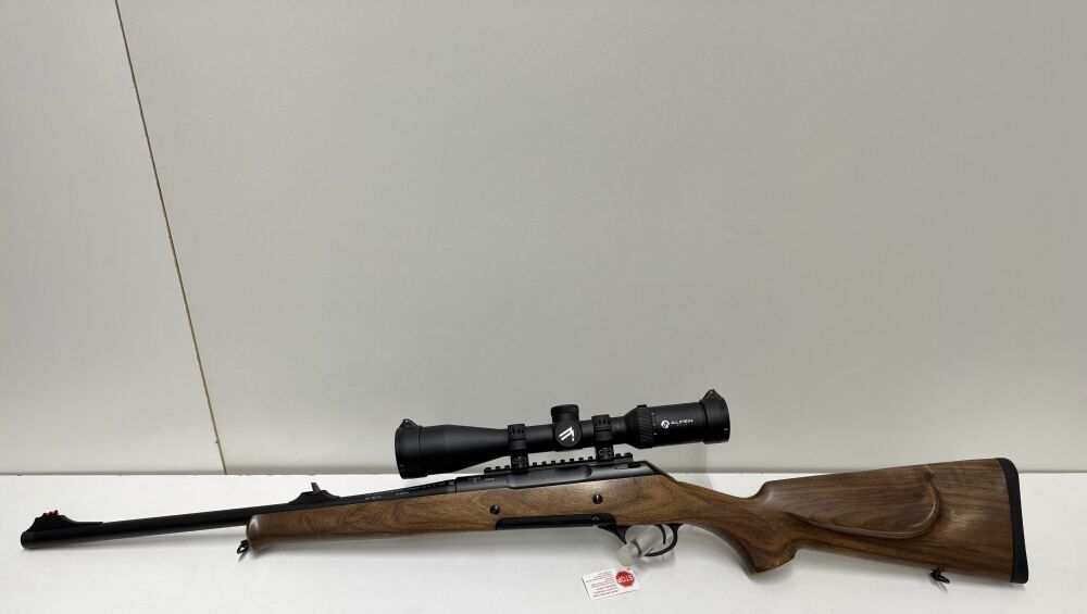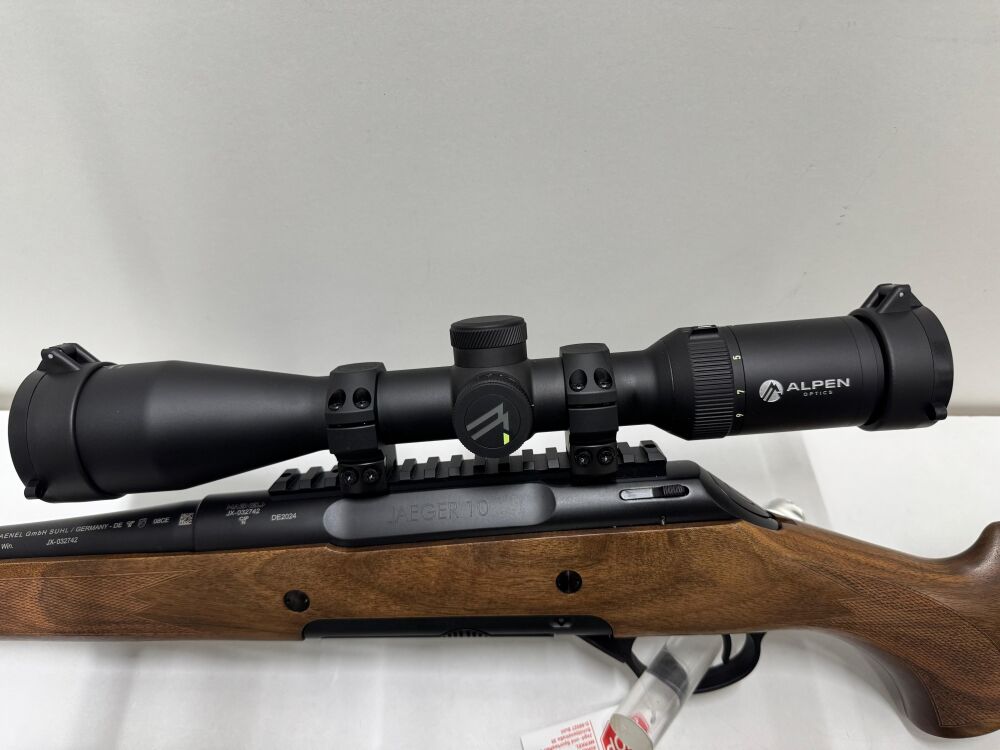 Wunderschönes Komplettset der Haenel Jaeger10 Timber Compact im souveränen Universalkaliber .308 Win. montiert und eingeschossen mit dem Alpen Optics APEX 1,5-9×45 mit intelligenten Leuchtpunkt und leuchtenden Zahlen auf der Vergrößerungseinstellung. Nach Abnahme des ZFR kann bequem über die offene Visierung geschossen werden. Kurze und führige Büchse für alle Einsatzzwecke „Made in Germany / Suhl“. Eingeschossen wurde die Büchse mit der GECO Star bleifrei 10,7g / 165grs. Deformationsgeschoss