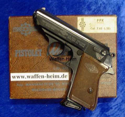 # Pistole Walther PPK mit Stahlgriffstück, gefertigt bei Manurhin in sehr gutem Zustand mit original Karton und Ersatzmagazin. www.waffen-heim.de
