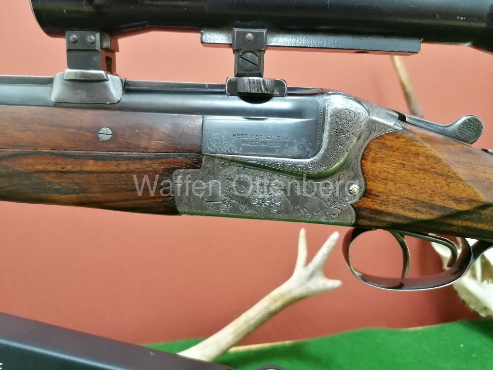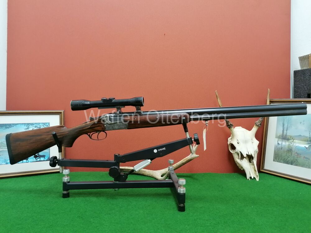 Bockdoppelflinte Merkel 201 E im Kaliber 12/70 mit 3/4 und Voll-Choke ZF Carl Zeiss Jena 6/S Einhakmontage PmB Schaftlänge: 36,5 cm Lauflänge: 71,5 cm Gesamtlänge: 113 cm ...weiterlesen