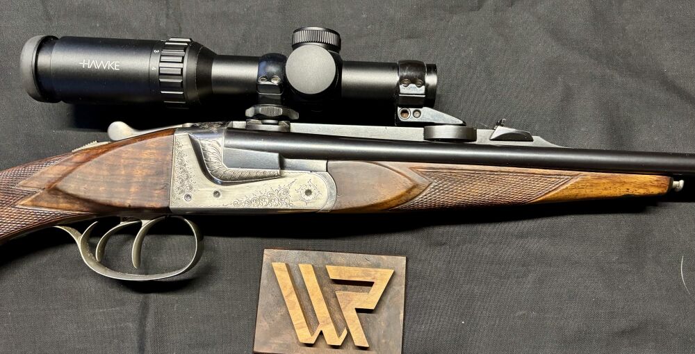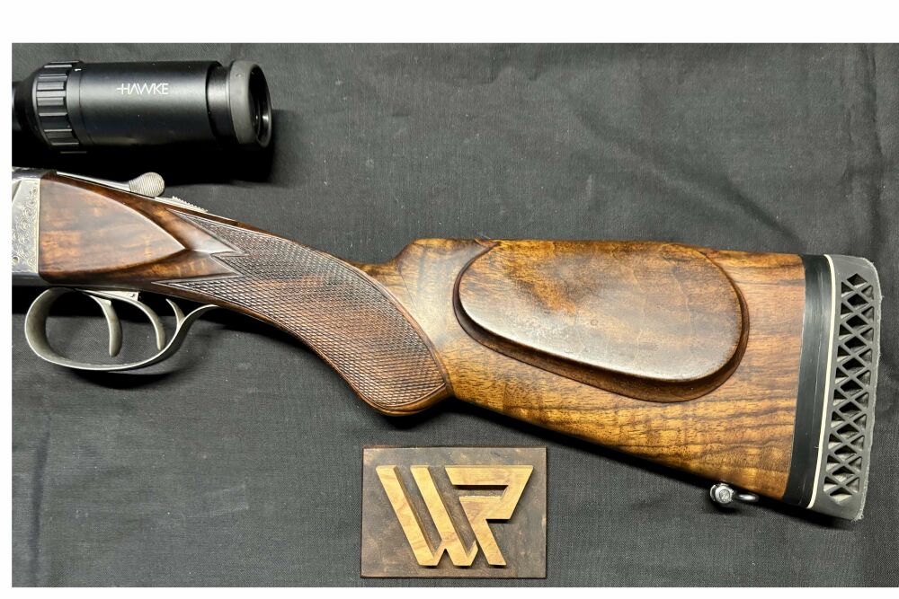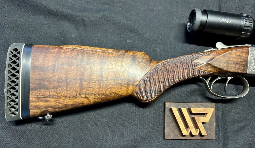 Schaftlänge 34 cm (Verlängerter auf 37 cm) Lauflänge: 60 cm ZF: 1 -4 Faches Hawke mit Leuchtpunkt Recknagel Schwenkmontage Ejektor weich stehende Abzüge Purdyverchluß zirkopoliert Hochwertige Doppelbü... ...weiterlesen