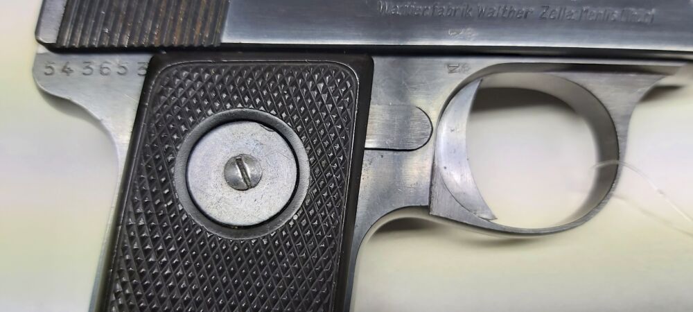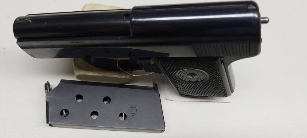 Die Pistole weist eine originale Hochglanzbrünierung auf , lediglich vorne links am Schlitten befinden sich zwei kleine rostnarbige Stellen , der Lauf ist innen schön blank , makellose originale Bakelitgriffschalen , das Magazin ist von einer FN-Baby , Original-Beschuß Krone über N , kein Neubeschuß !