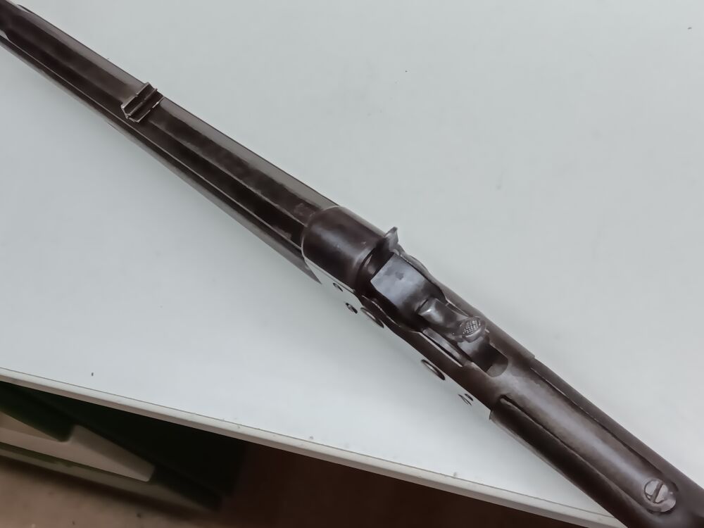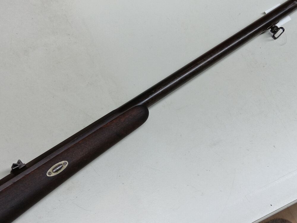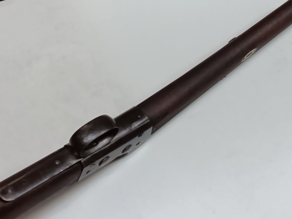 Einzelladerflinte mit einem 85 cm langen matt-rauen Lauf , Rolling-Block-System mit eiwandfreier Funktion , Flintenabzug , 3-teilige Klappkimmenblätter , seitenverschiebbares Korn , 2 Riemenbügel , der Holz-Vorder-und Hinterschaft wurde komplett überarbeitet und matt geölt , metallblanke Stahlschaftkappe , die brünierten Metalloberflächen sind stellenweise leicht berieben , Gesamtlänge 125 cm , Schaftmass 35 cm , Visierlänge 63 cm , Seriennummer : 41451 , Schwedischer Beschuß , kein Neubeschuß vorhanden