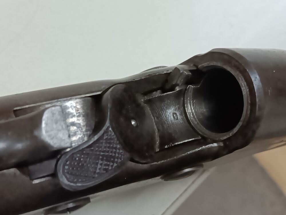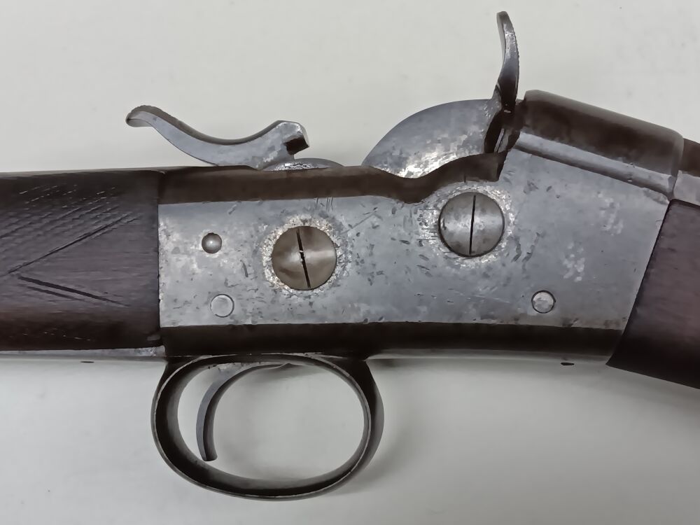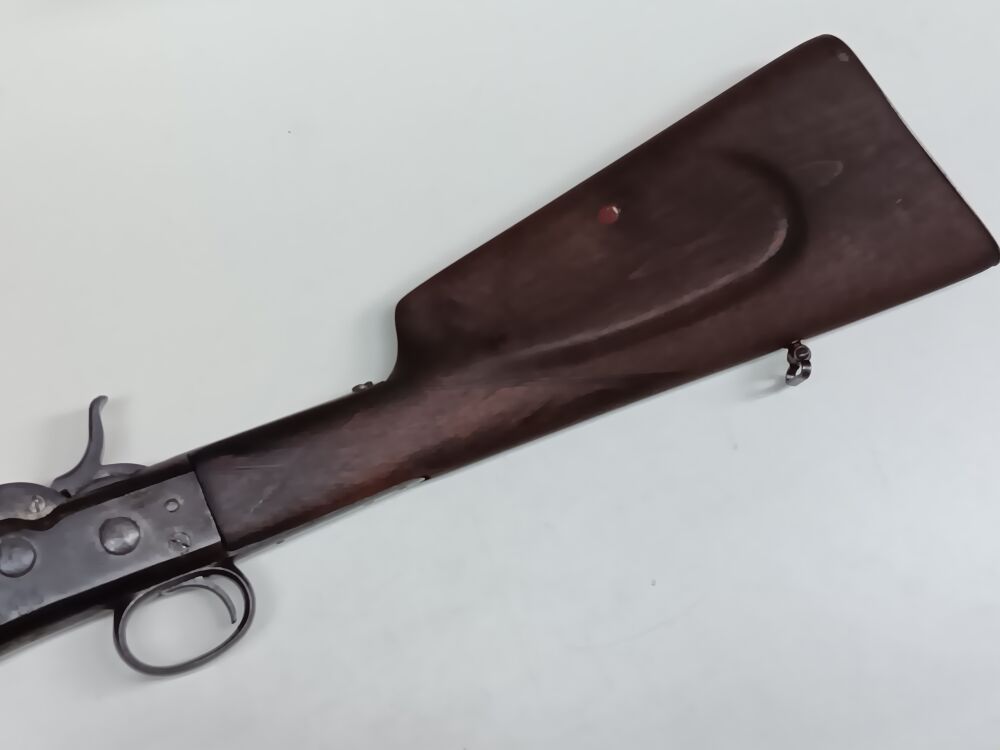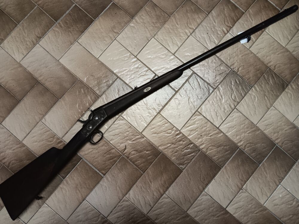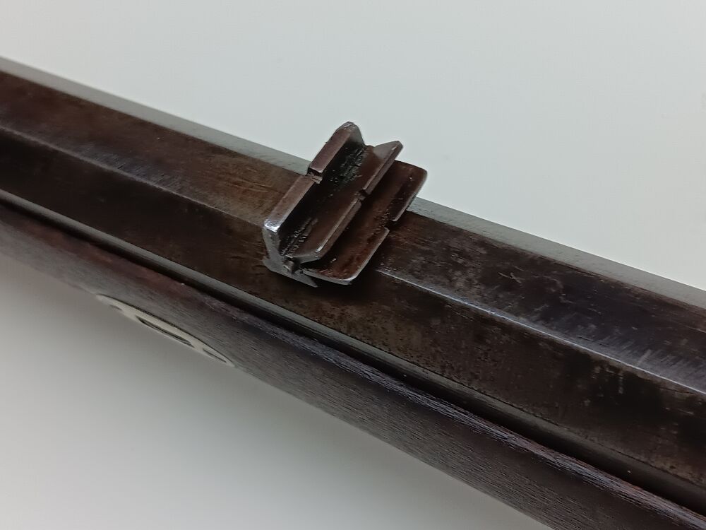 Einzelladerflinte mit einem 85 cm langen matt-rauen Lauf , Rolling-Block-System mit eiwandfreier Funktion , Flintenabzug , 3-teilige Klappkimmenblätter , seitenverschiebbares Korn , 2 Riemenbügel , de... ...weiterlesen