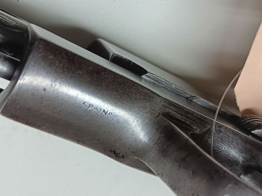 Eine von vielen Spanischen Herstellern gefertigte Erster Weltkrieg - Behelfspistole mit interessanter Beschriftung , alle Oberflächen sind Metallblank , Single-Action Abzug , keine Sicherung , feste Visierung , glatte Holzgriffschalen , originales Stahlblechmagazin für 9 Patronen , der 84 mm lange Lauf ist innen mattblank , Gesamtlänge 155 mm , Höhe 130 mm , Visierlänge 110 mm , nicht nummerngleich