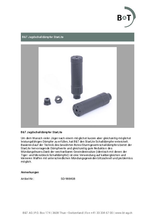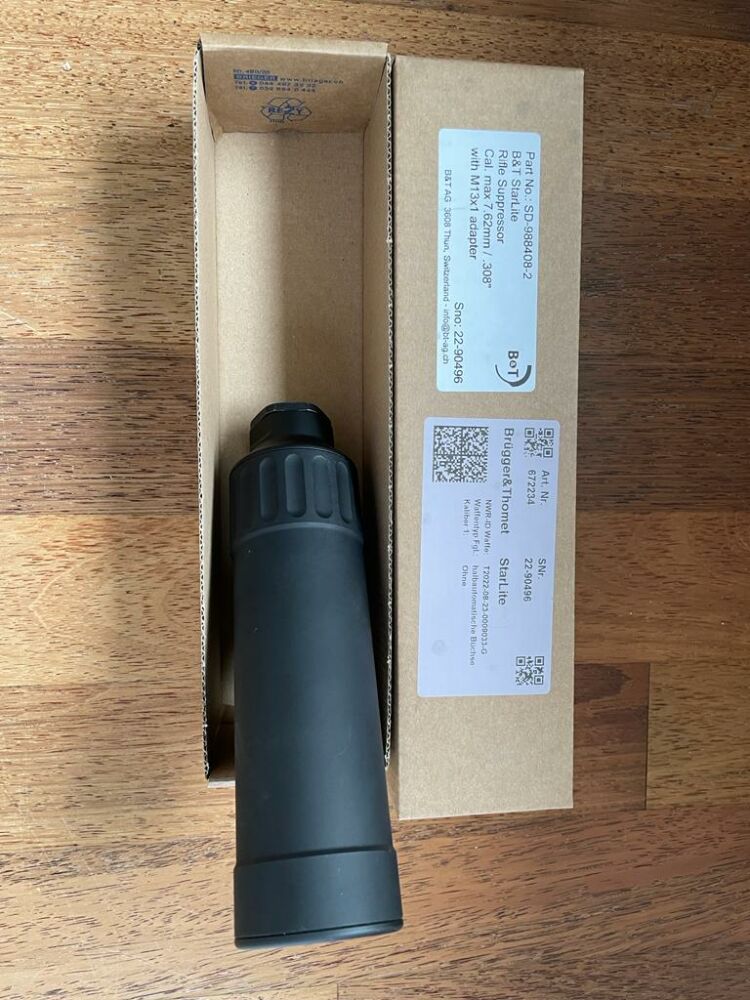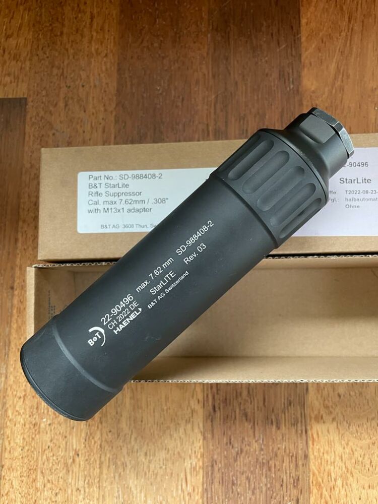 B&T Jagdschalldämpfer StarLite Brügger&Thomet Schalldämpfer StarLite .308 (6,3-8,2mm) Modellbezeichnung: StarLite M13x1 für Gewinde rechts   Der Artikel ist neu. kurzer und leis... ...weiterlesen