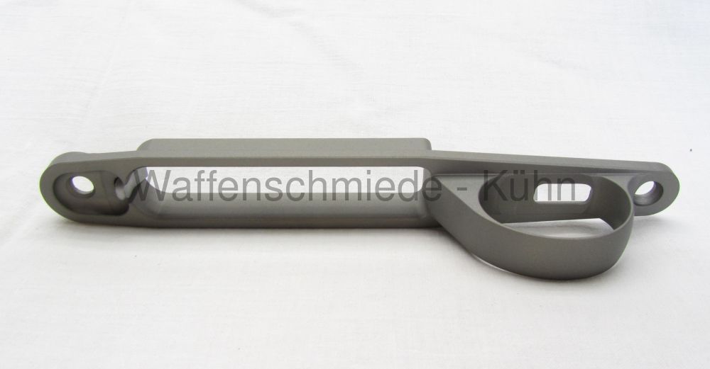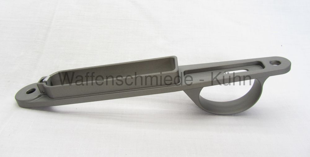 Unser Abzugsbügel für die Tikka T3 ist komplett aus den Vollen gefräßt und mit einer Hartanodschicht (wie Eloxal nur härter) in Silber-Grau matt versehen. Er passt ohne jede Nacharbeit und die orginalen Magazine können selbstverständlich weiter genutzt werden. Die Funktion und Bedienung unterscheidet sich nicht vom Orginal, jedoch ist er durch den Werkstoff Aluminium nicht nur leicht (57 Gramm) sondern um einiges stabiler als sein Vorbild. Die Schaftbefestigungsschrauben werden wesentlich besser gehalten reißen mit Sicherheit nicht aus und halten das System um einiges besser.