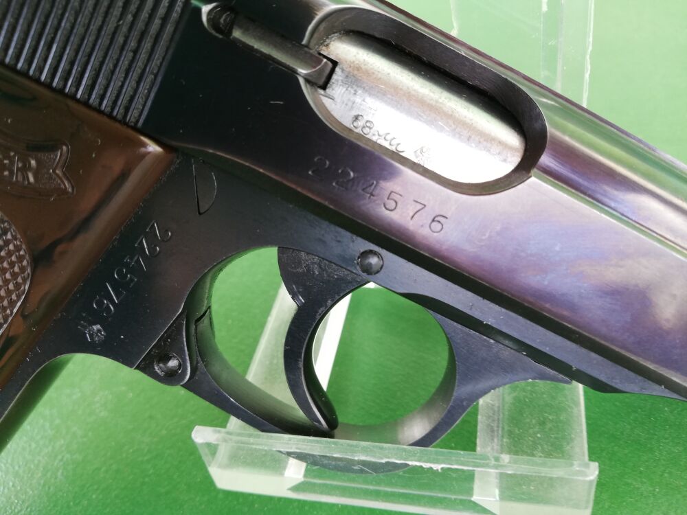 Walther PPK Kal. 7,65mm gebraucht im Karton mit Adapterpatronen , wie auf Bild Beschuß 1968 Ulm Waff.-Nr. 224576 ...weiterlesen