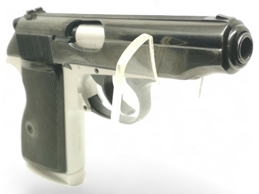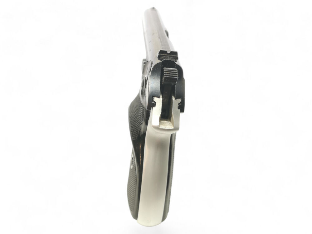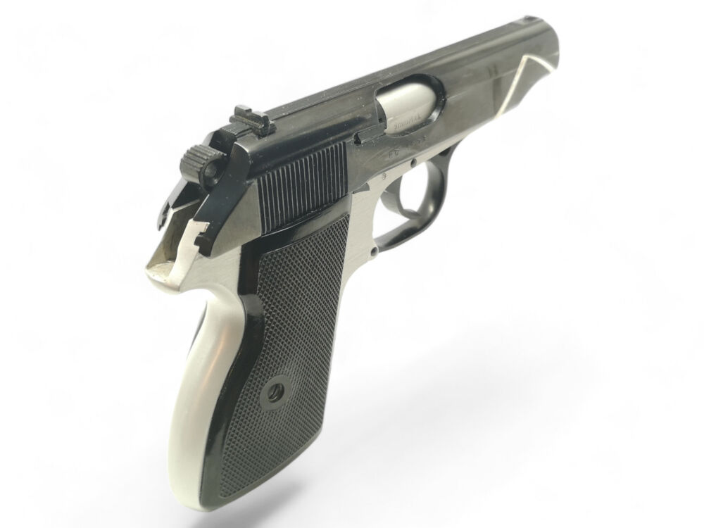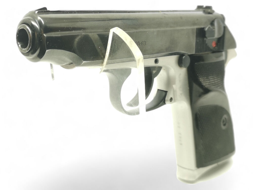 Besonderheit: ungarischer Makarov-Nachbau, bicolor, mit linksseitiger Sicherung, Kunststoffformgriffschalen für Rechtshänder (Daumenauflage links), 2 Magazinen, gepflegt im guten Zustand, voreintragspflichtig