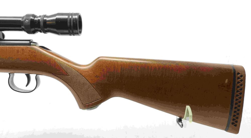 Besonderheit: führige KK-Büchse aus dem Hause Anschütz, Modell 1451, mit Norconia-ZF 3-9x40 unbeleuchtet, Ringmontage, Schiebekimme, Korn demontiert und nicht dabei, 5Schuss Magazin, glatter nicht geschränkter Hinterschaft mit Schaftkappe (ventiliert), Riemenbügelösen, bis auf das demontierte Korn eine gepflegte Waffe f. Sport & Jagd