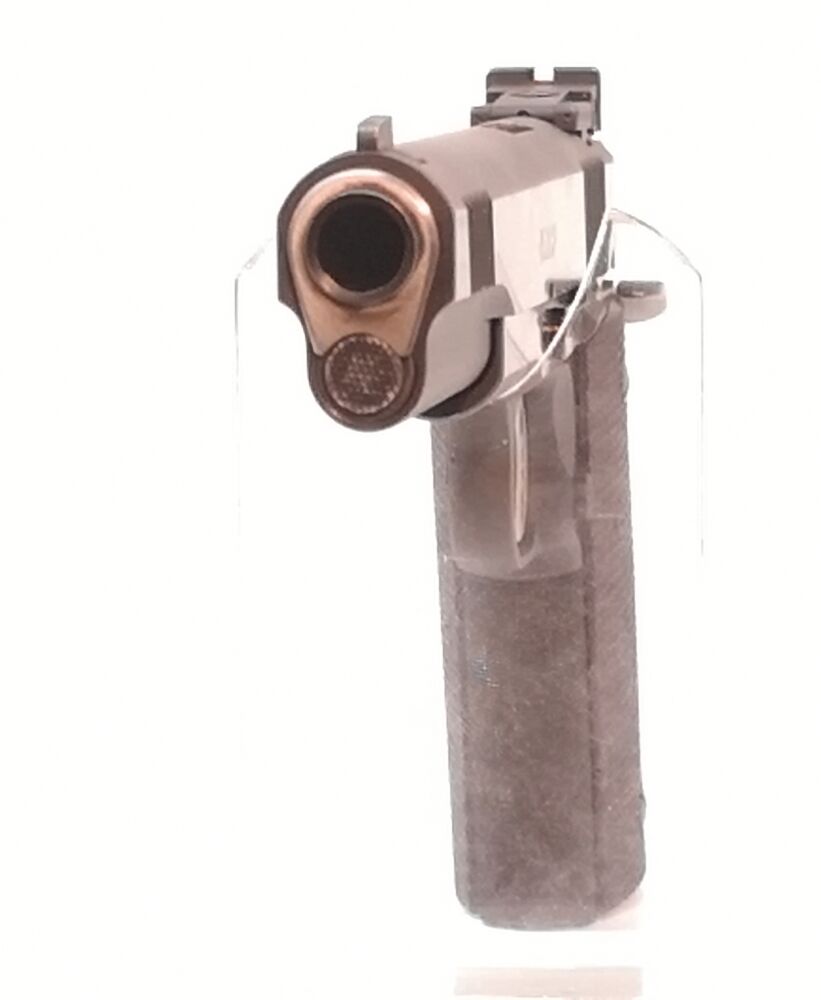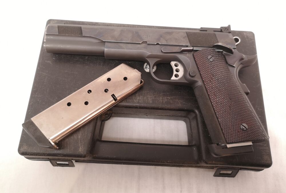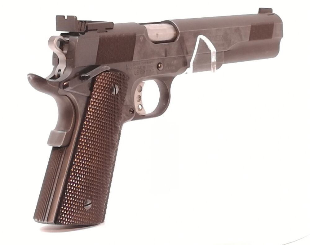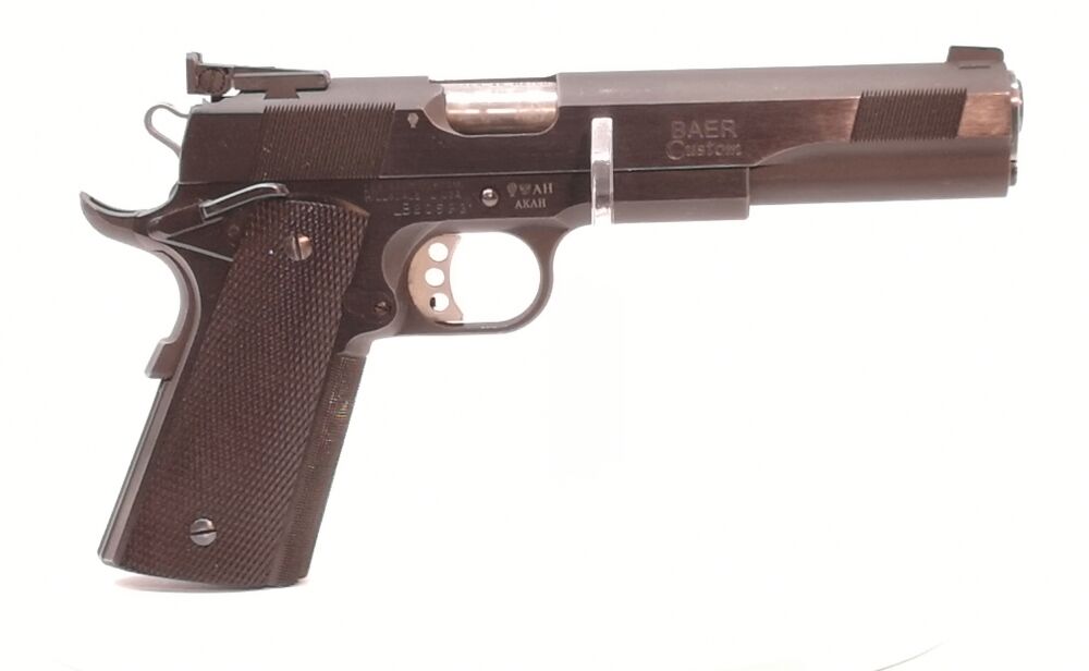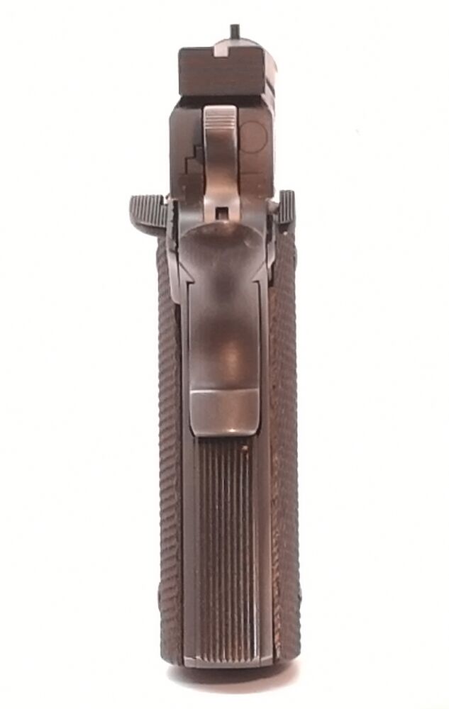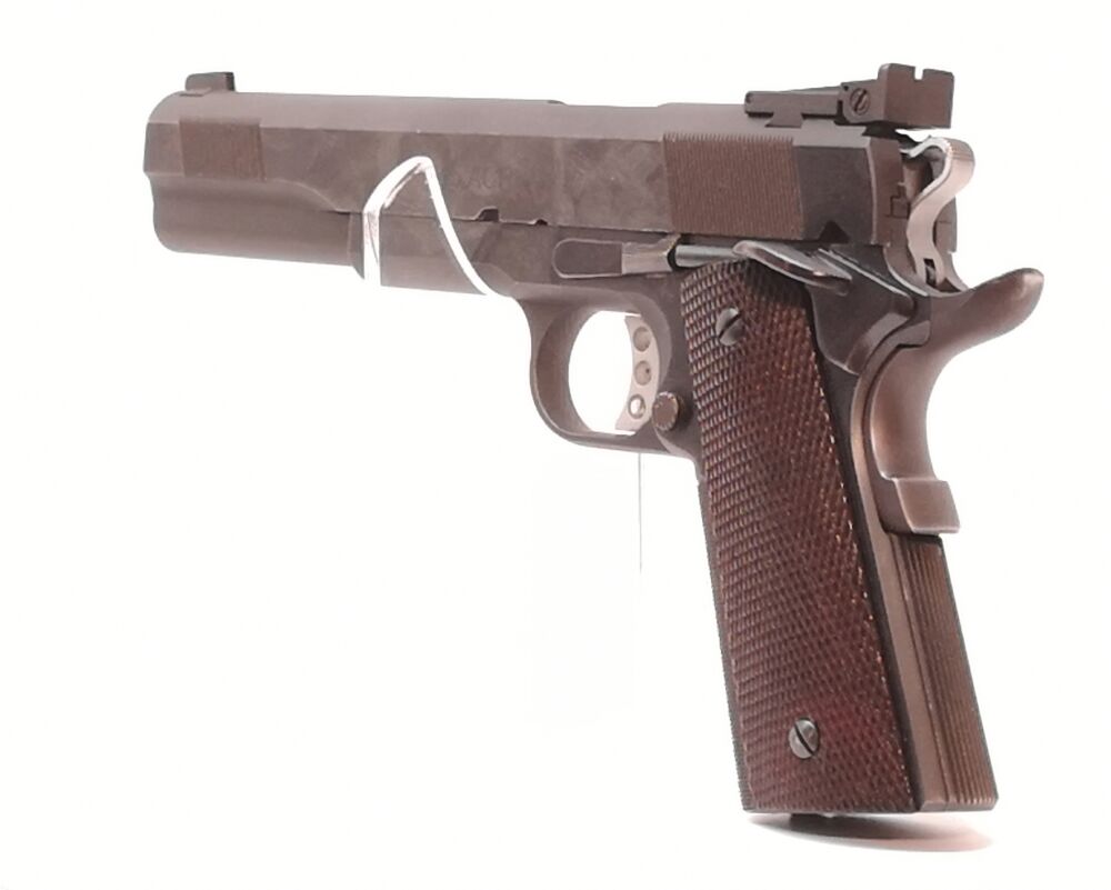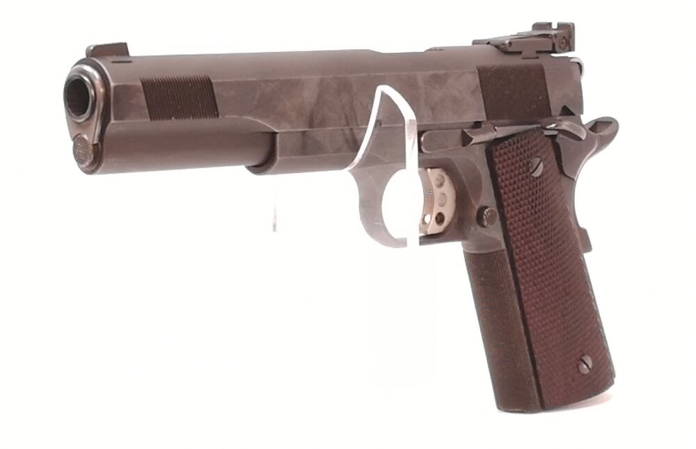 Besonderheit: äußerst präzise Sportpistole als 1911er Variante, Griffschalen aus Nussholz, allgemein guter Zustand (Note 2), beidseitige Sicherung, skelettierter Hahn und Abzugszüngel