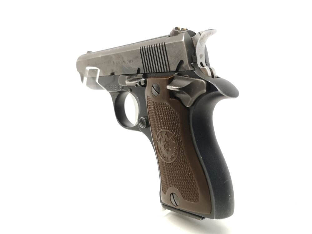 Besonderheit: kompakte spanische Pistole im Kal. 9mmBrowningkurz, mit Kunststoffgriffschalen und offener Gebrauchsvisierung (Kimme + Korn), linkseitige Sicherung, mit 2tem Magazin und Lederholster, Gesamtzustand Note 2,5 (abgerundet 3), technisch in Ordnung *** voreintragspflichtig ***