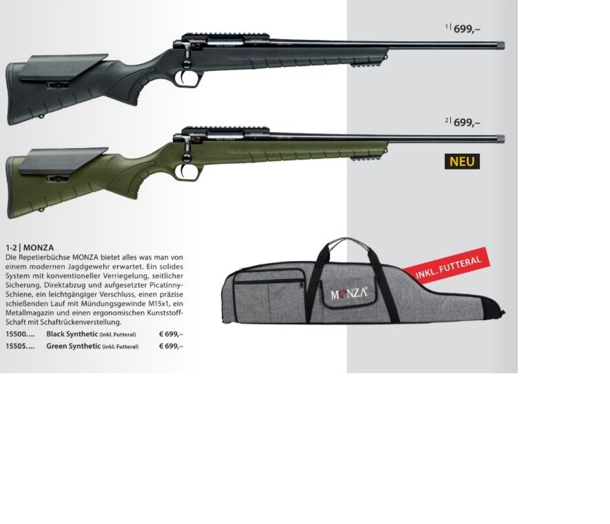 Die Repetierbüchse MONZA bietet alles was man von einem modernen Jagdgewehr erwartet. Ein solides System mit konventioneller Verriegelung, seitlicher Sicherung, Direktabzug und aufgesetzter Picatinny-... ...weiterlesen