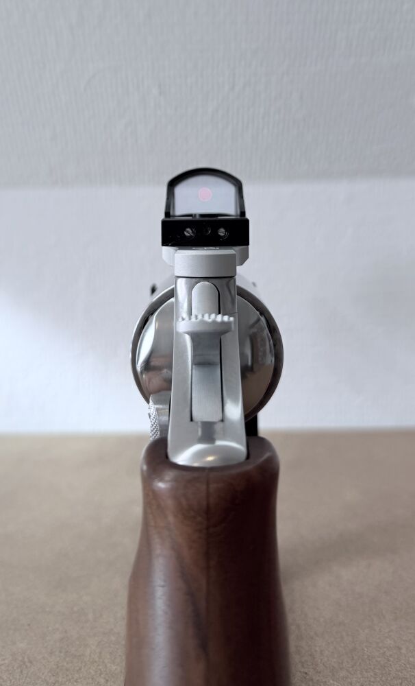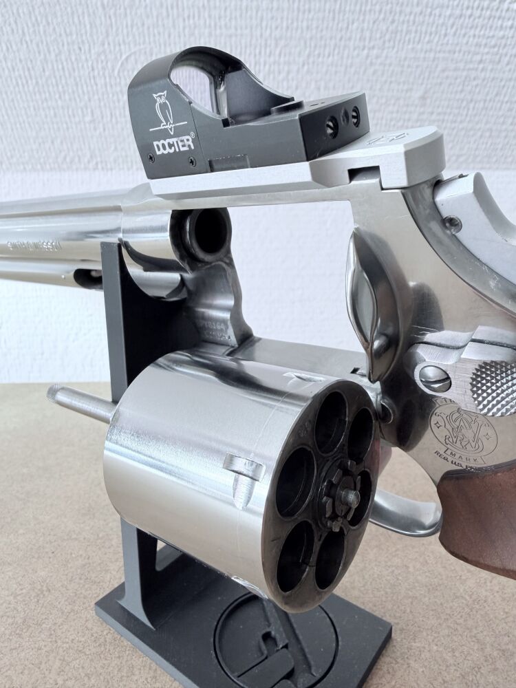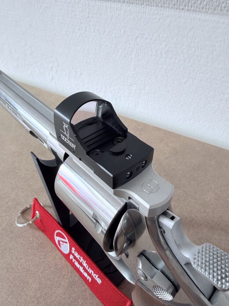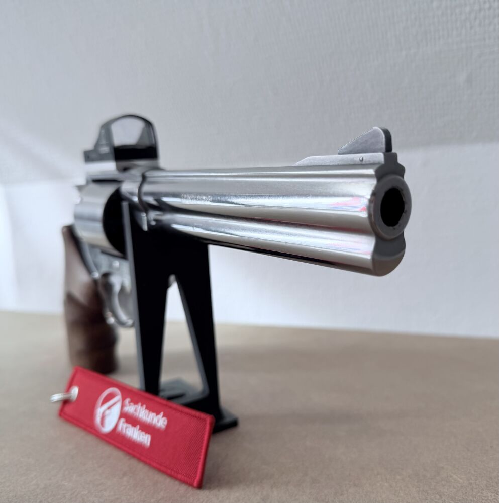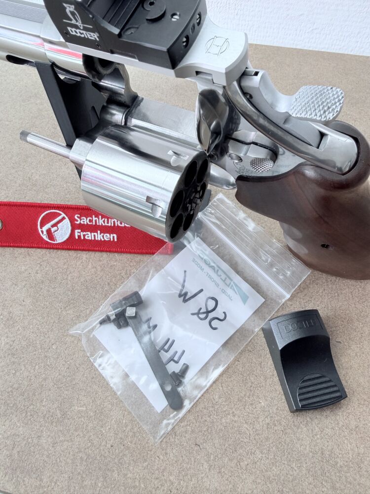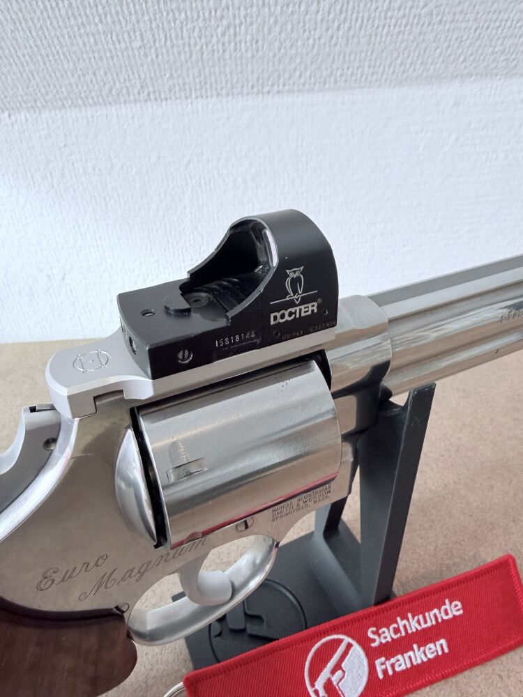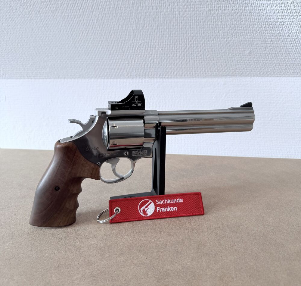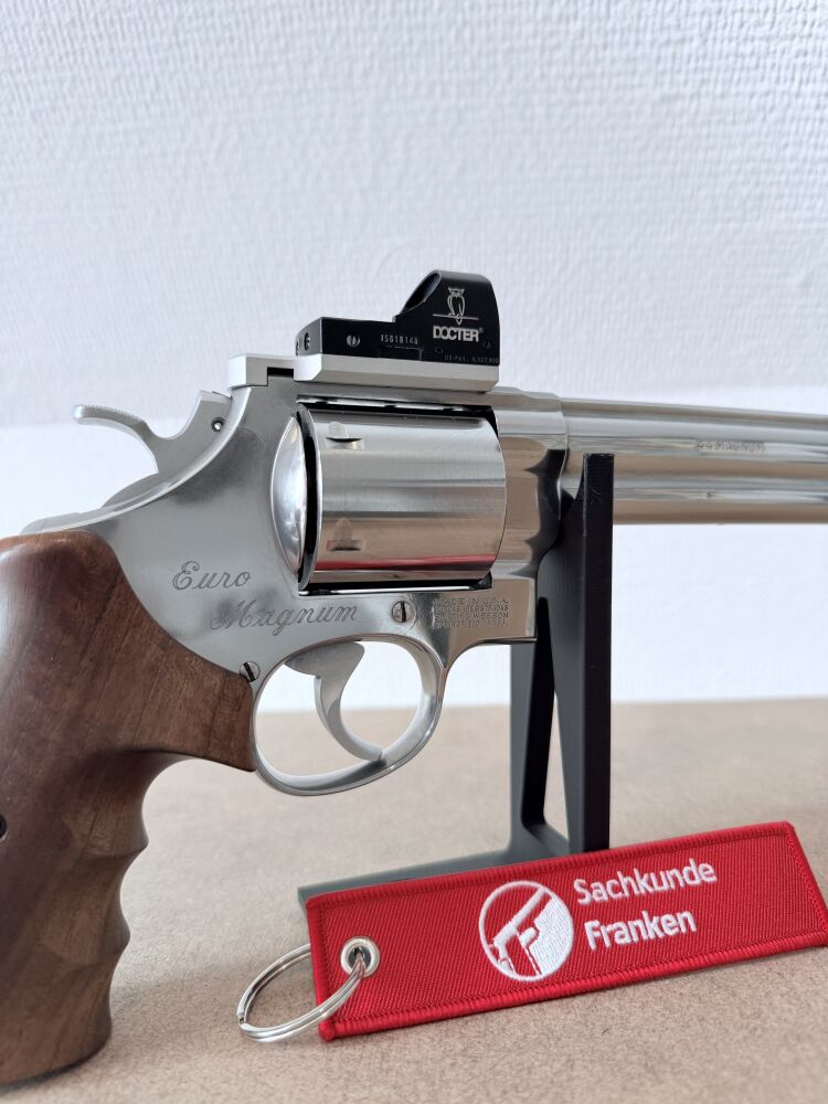 Verkauft / vermittelt wird im Kundenauftrag ein gebrauchter, gepfleger Revolver der Firma Smith & Wesson, Model 629-4 Edition "Euro Magnum" im Kaliber .44 Magnum / .44 Special. Inklusive montiertem Docter-Sight Rotpunkt-Viser auf entsprechender Montageplatte und Nill-Holzgriff. Die originale Kimme ist ebenfalls enthalten und kann wieder montiert werden.
