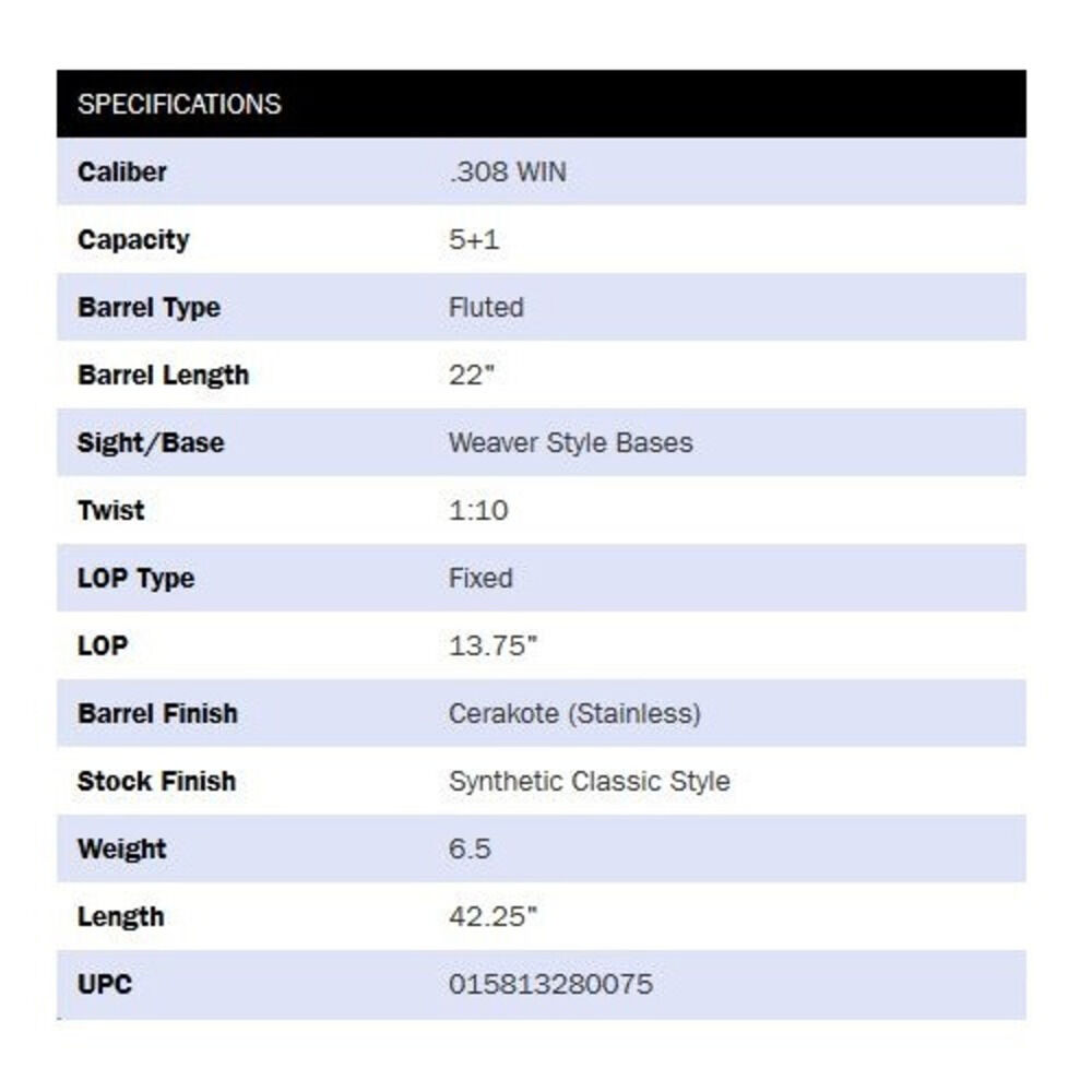 Kaliber .308Win, Rep.Büchse Patriot Synthetic Cerakote 5+1 Patronen, Lauflänge 22"/55,9cm, kannelierter Verschluss, Lauf gefluted, entnehmbares 5/fünf Patronen Magazin, Weaver Montageschiene 2-teilig, Synthetic Schäftung schwarz Classic Style, Lauf und System Cerakote Stainless, Patented LBA® Abzug verstellbar von 2lbs/908gramm bis 7lbs/3.178gramm, Gesamtlänge 42,25"/107,3cm, Gesamtgewicht 6,5lbs/2.951gramm ohne Munition, Code 28007 Mossberg USA. Verkauf solange vorrätig!