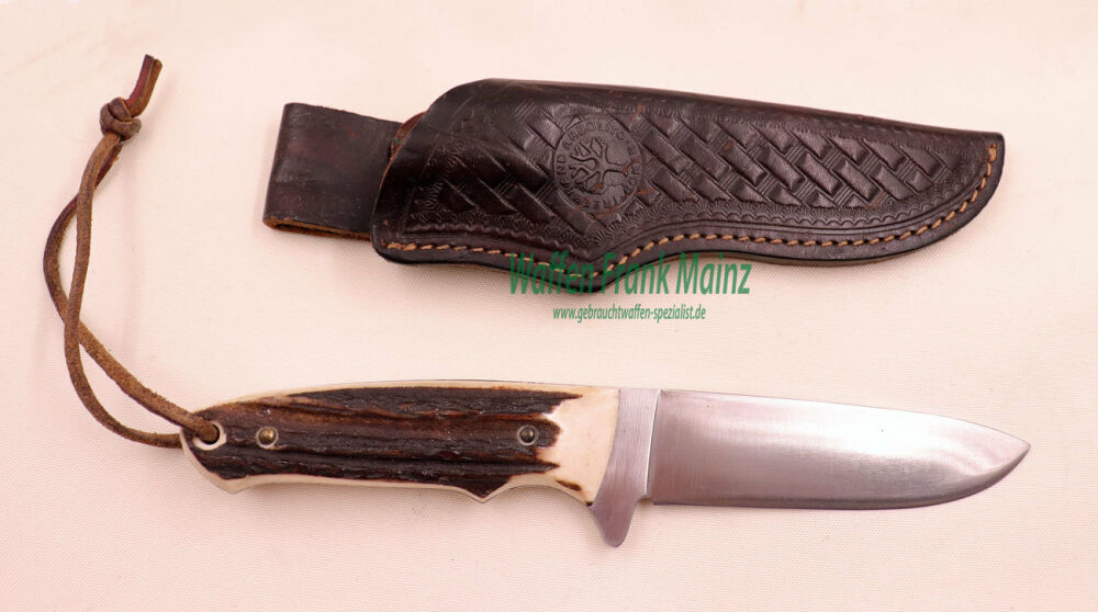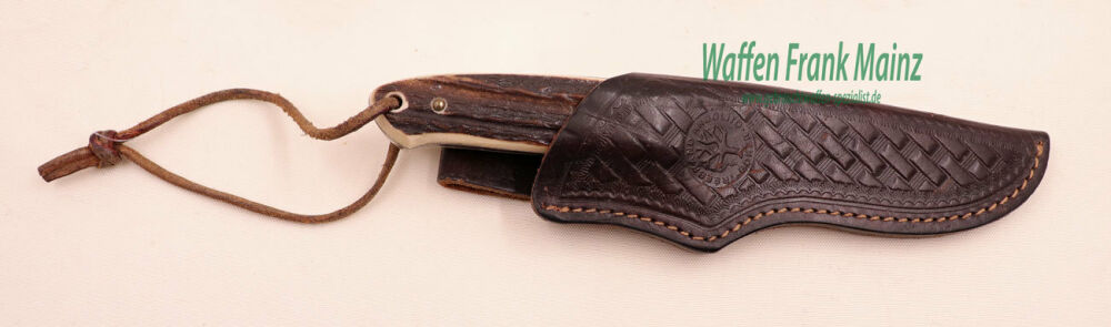 Integralklinge aus Stainlessstahl 440C, mittlerer Klingendurchmesser 4,7x28mm, sehr gute Hirschhornbeschalung, mit Leder Gürtel-Steckscheide, mit Flechtmusterprägung