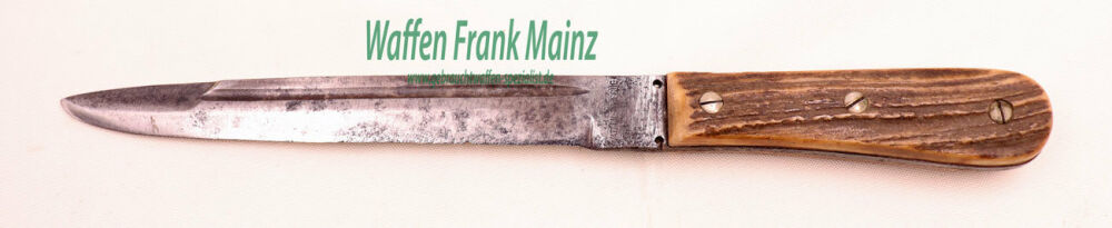 Parierstange fehlt, fachlich Hirschorn beschalt, vermutlich Bajonettklinge mit Blutrinne überarbeitet und Spitze in Dolchform gearbeitet, Klingenheft mit Firmenbeschriftung links "Waffen Lösche, Berlin", rechts "C.h.A.W", ohne passende Scheide.......ein interessantes Stück mit viel Restaurierungspotenzial...