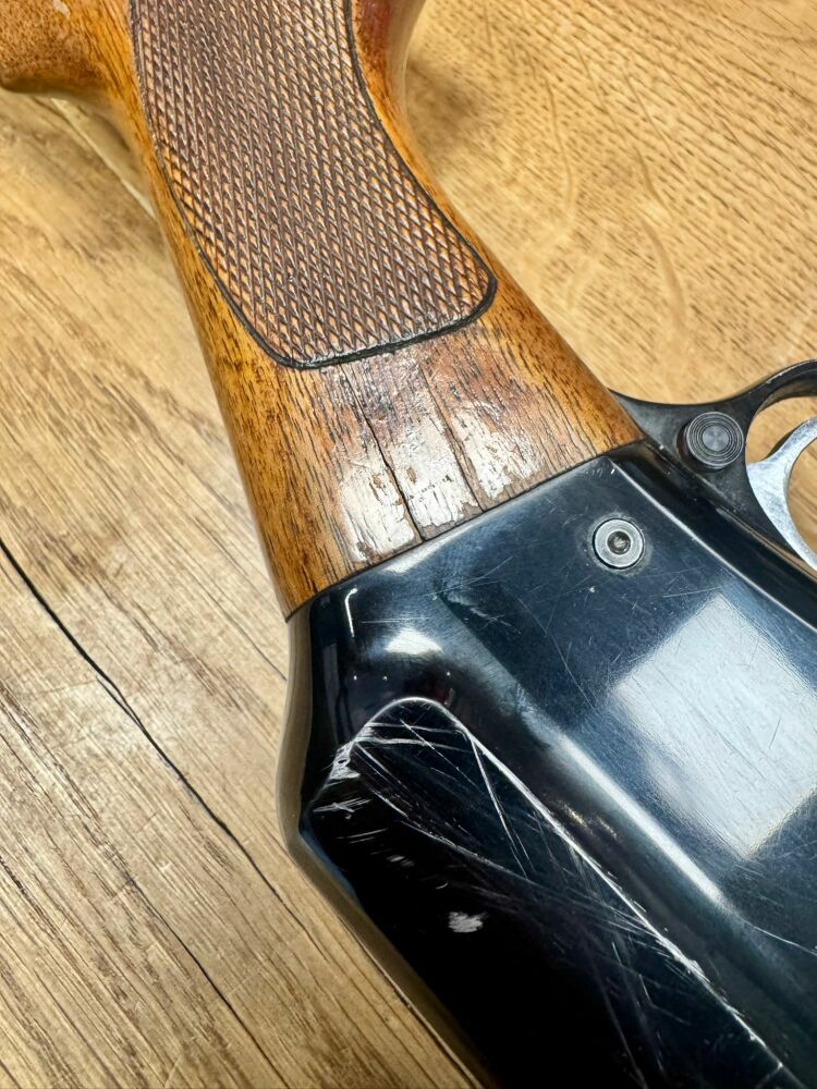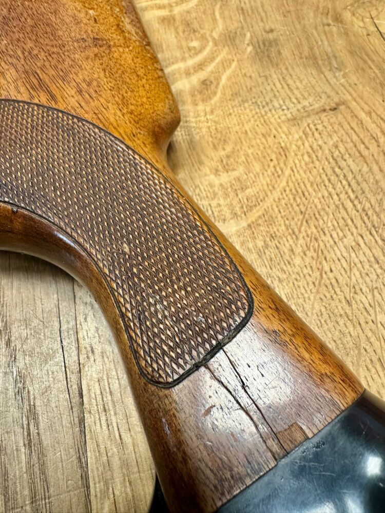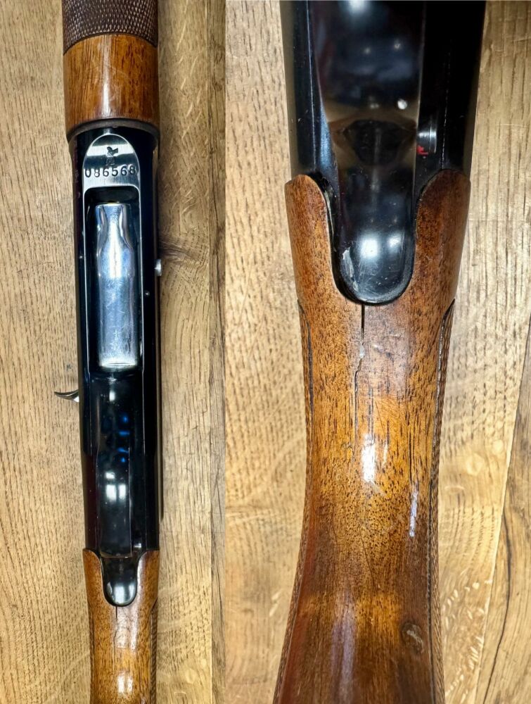 Die Waffe hat starke Gebrauchspuren, siehe Fotos. Brünierung und Basküle abgewetz, kein Rost. Tiefe Kratzer und Macken, sowie Risse im Holz (auf den Fotos sichtbar), Technische Funktion nicht eingeschränkt.