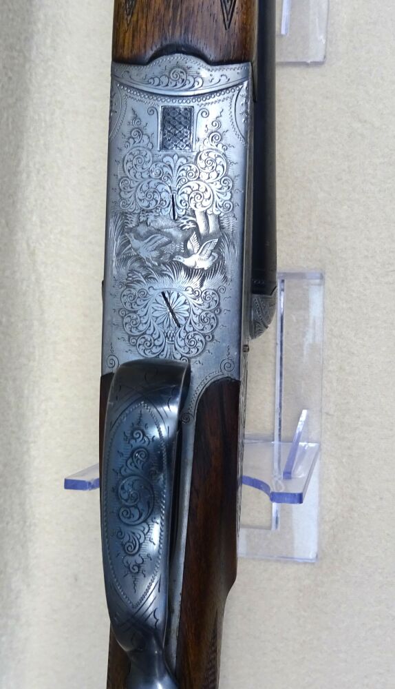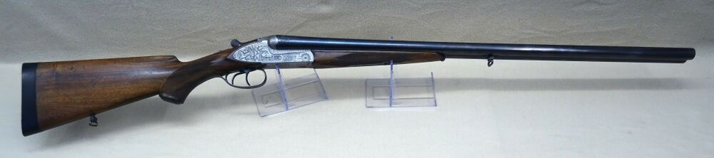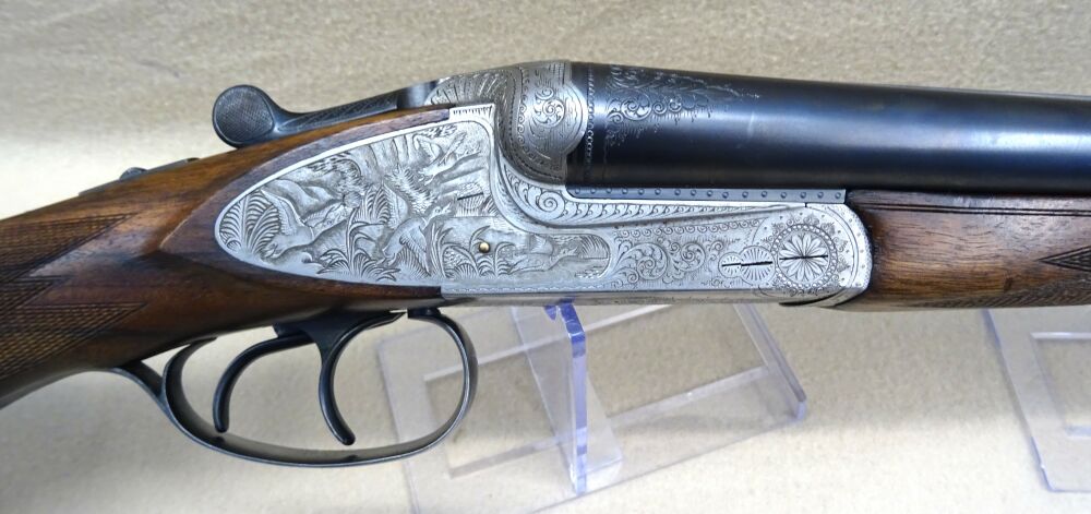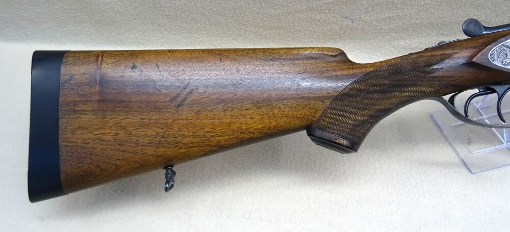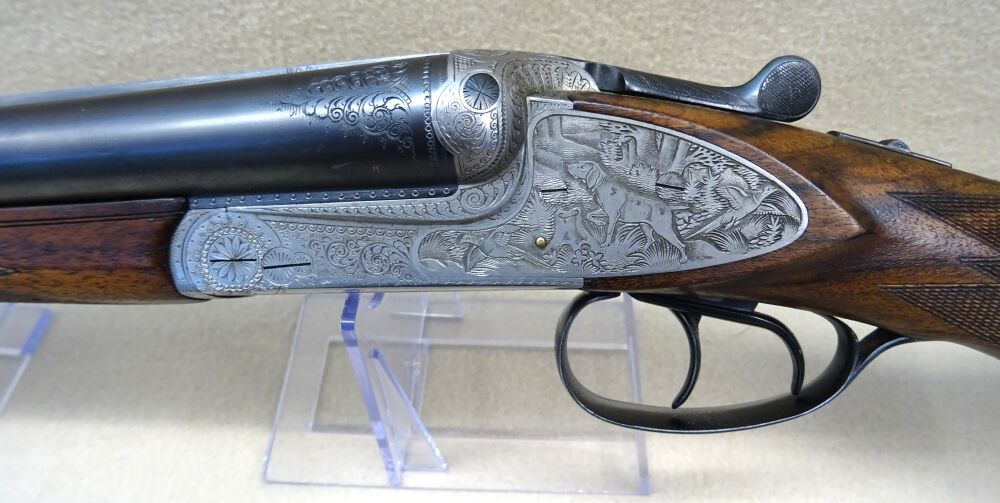 Die Doppelflinte des Hersteller Simson Suhl im Kal 12/70 ist in einem Holzschaft mit