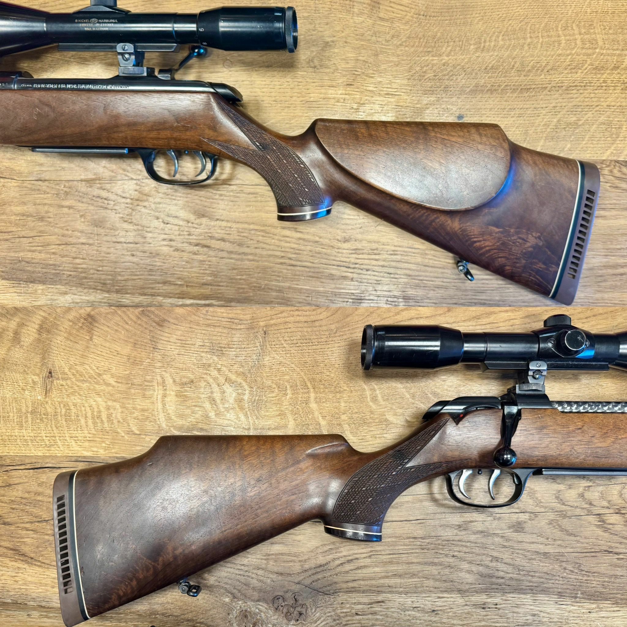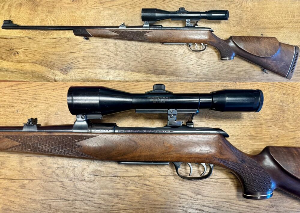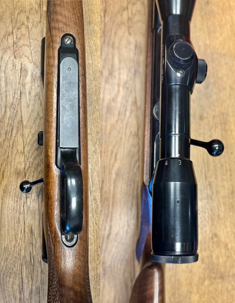 Die Waffe ist in gutem gebrauchtem Zustand, siehe Fotos. Brünierung schwarz und gut erhalten, kein Rost und der Schaft schön erhalten mit leichten Dellen und Kratzern vom jagdlichen Einsatz