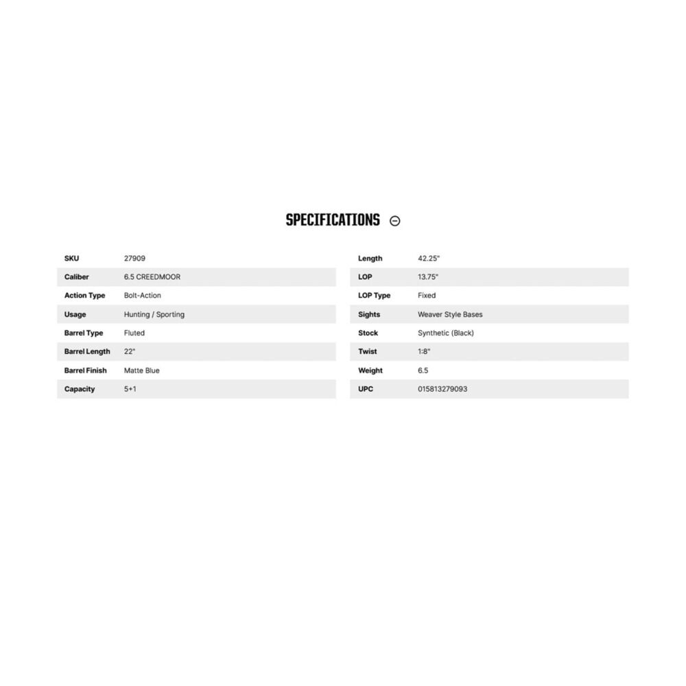 Kaliber 6,5mmCreedmoor, Rep.Büchse Patriot Synthetic 5+1 Patronen schwarz matt, Lauflänge 22"/55,9cm, kannelierter Verschluss, Lauf gefluted, entnehmbares 5/fünf Patronen Magazin, Weaver Montageschiene 2-teilig, Synthetic Schäftung schwarz Classic Style, Lauf und System Black Stainless, Patented LBA® Abzug verstellbar 2lbs/908gramm bis 7lbs/3.178gramm, Gesamtlänge 42,25"/107,3cm, Gesamtgewicht 6,5lbs/2.951gramm ohne Munition, Code 27909 Mossberg USA.