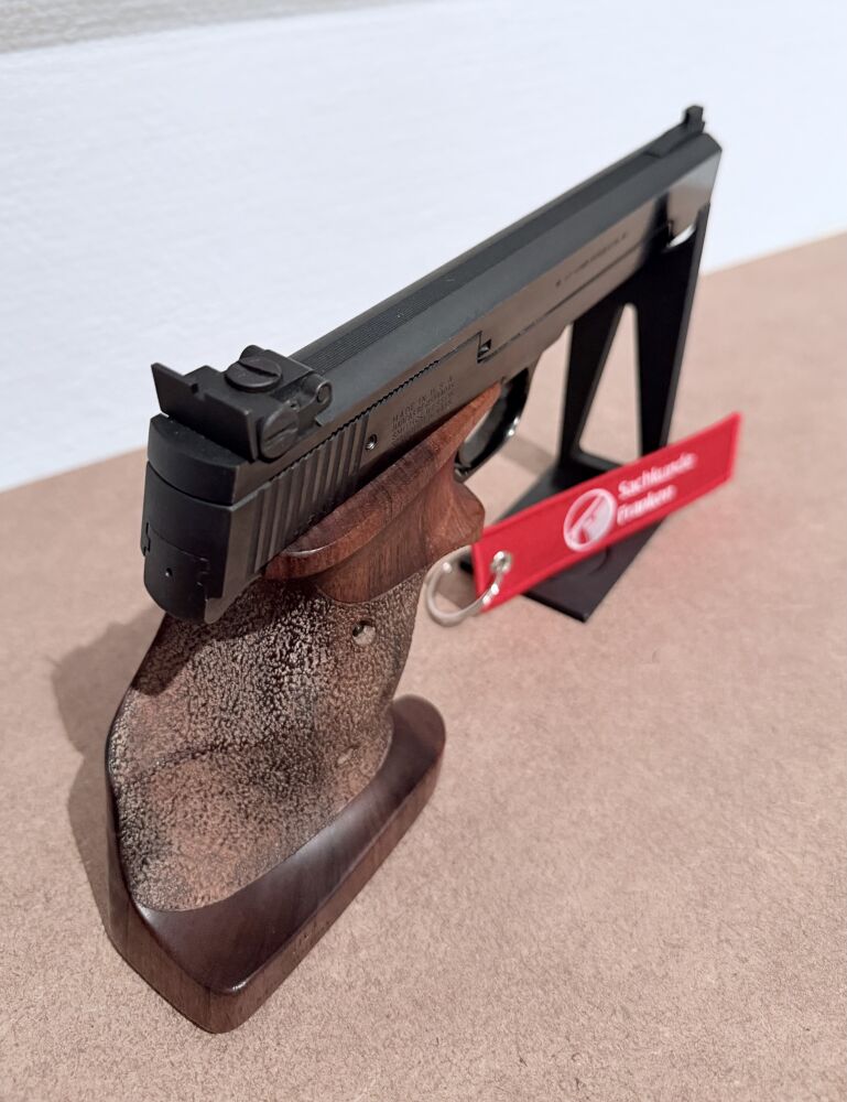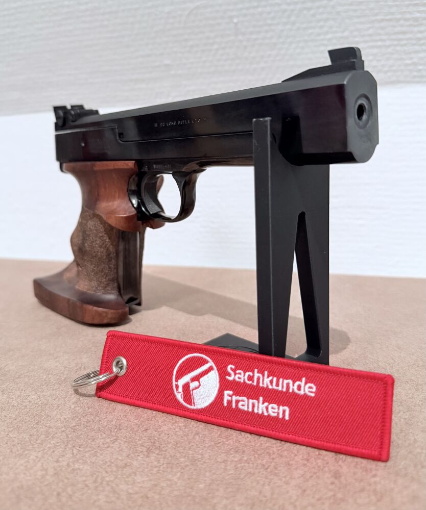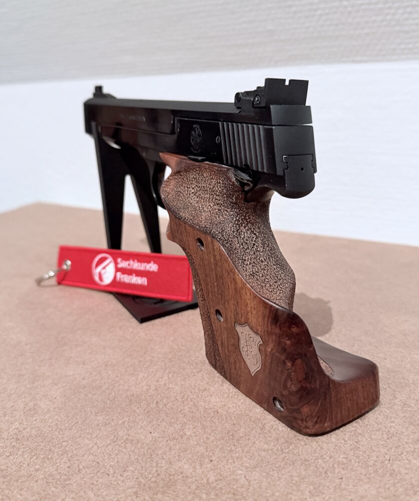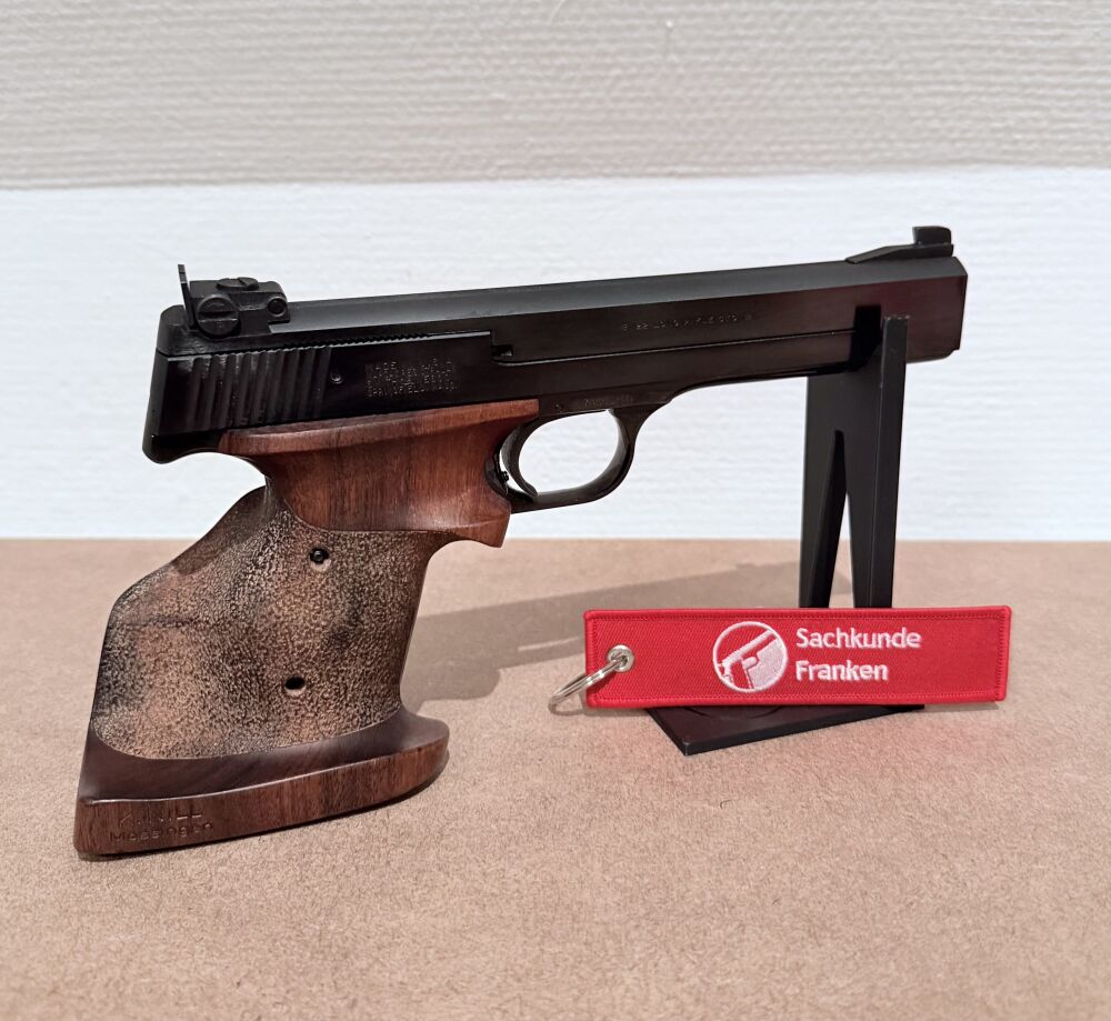 Gebrauchte und sehr gepflegte Smith & Wesson Model 41 KK-Pistole (.22lr/lfb) mit Formgriff für kleine Hände, einem 10-Schuss-Magazin und verstellbarer Sport-Visierung. Beschuss von 1969!